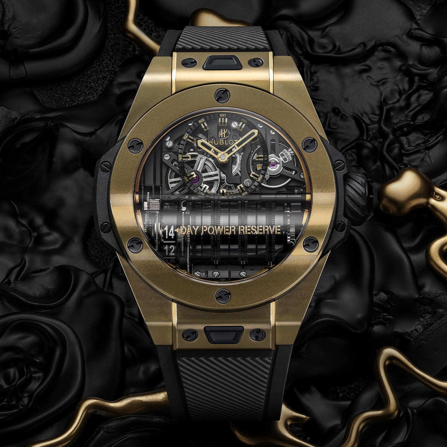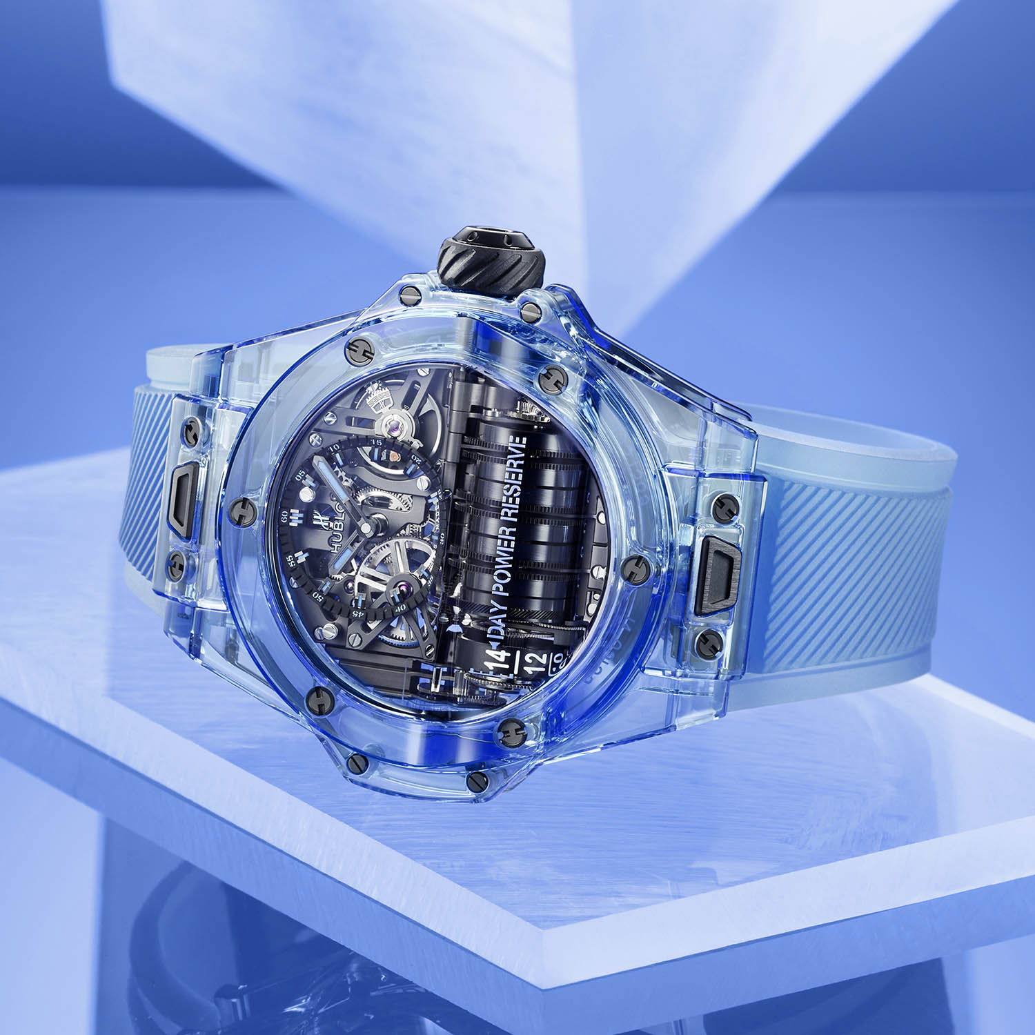 Quick Facts: magic gold or blue sapphire crystal case – 45mm x 14.40mm – water-resistant to 30m – hand-wound calibre HUB9011 with 7 coupled barrels – 14-day power reserve – rubber strap with folding buckle – reference 911.MX.0138.RX in gold and 911.JL.0119.RX in sapphire – limited editions of 50 pieces each – EUR 88,300 in gold and EUR 130,000 in sapphire
