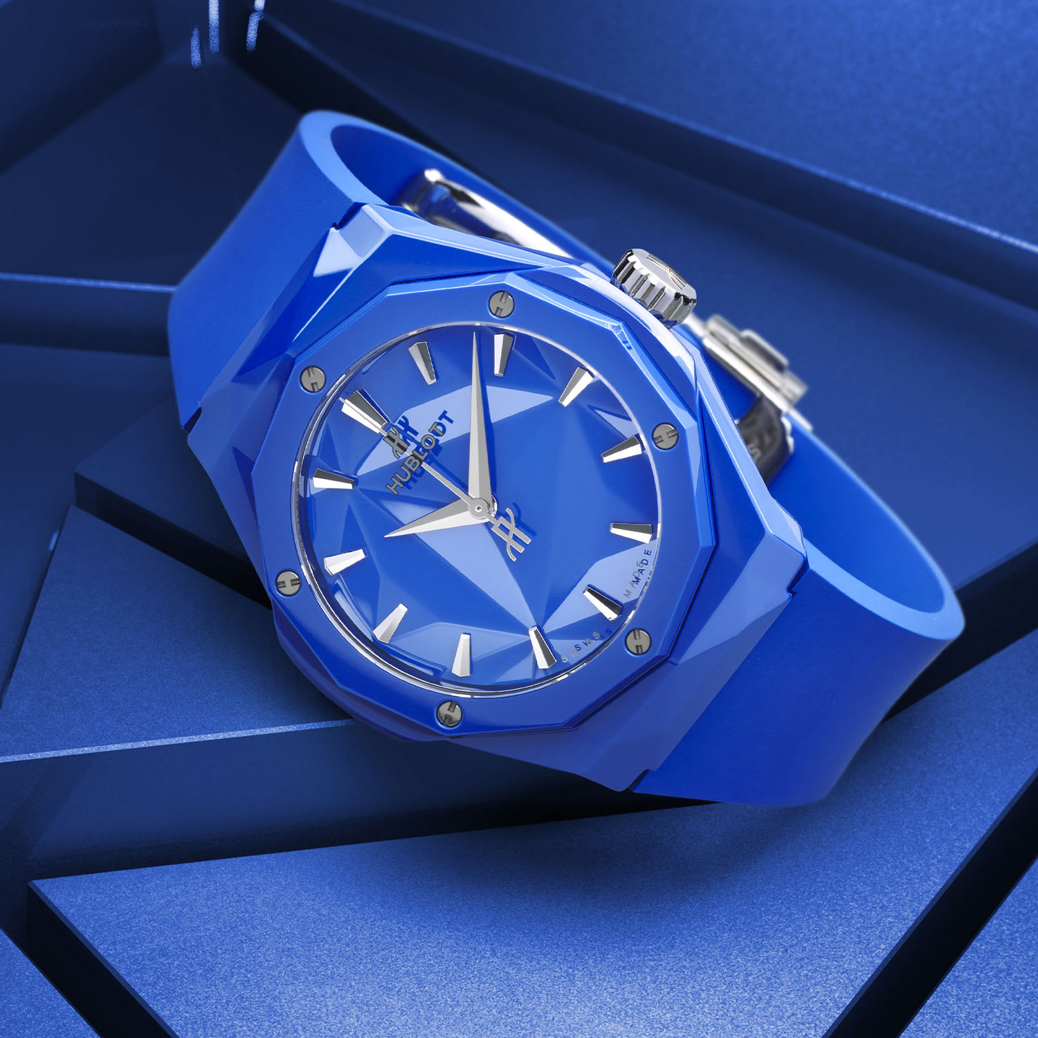 Quick Facts: flashy blue or glossy black ceramic case – 40mm x 11.10mm – water-resistant to 50m – automatic calibre HUB1100 (Sellita-based) – 42-hour power reserve – rubber strap with folding buckle – references 550.CS.1800.RX.ORL21 (black) or 550.ES.5100.RX.ORL21 (blue) – both priced at EUR 13,400