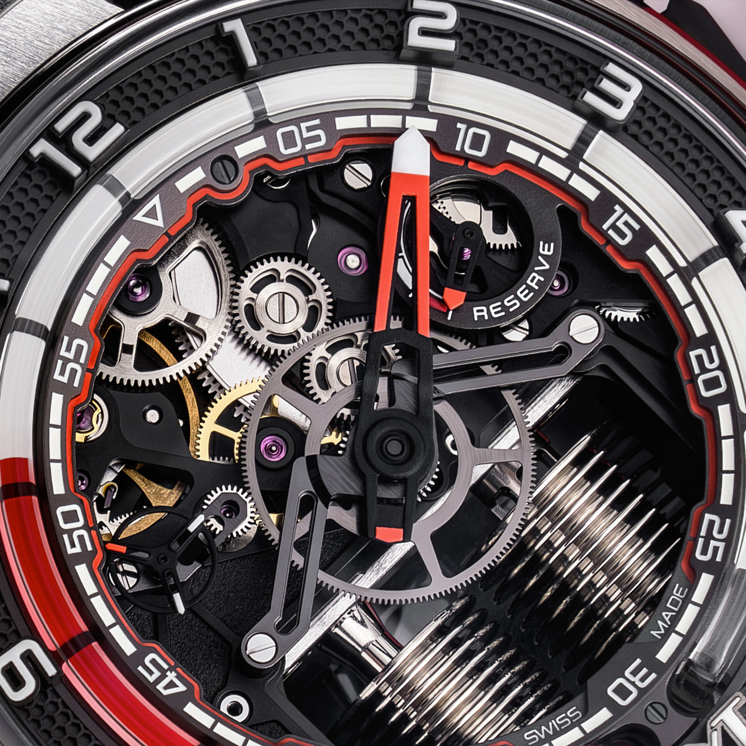 The chapter ring with the hour markers is also aerated like the lateral grilles and hosts Arabic numerals made from blocks of Super-LumiNova. A large skeletonised matte black hand with red and white Super-LumiNova indicates the black and white minutes track. First seen on the Hastroid Blue Star, the redesigned power reserve indicator and small seconds counter also appear here. Designed to be more legible, the openworked power reserve is positioned on the right and the small seconds opposite, both with red-tipped SLN hands and luminous white markings.
