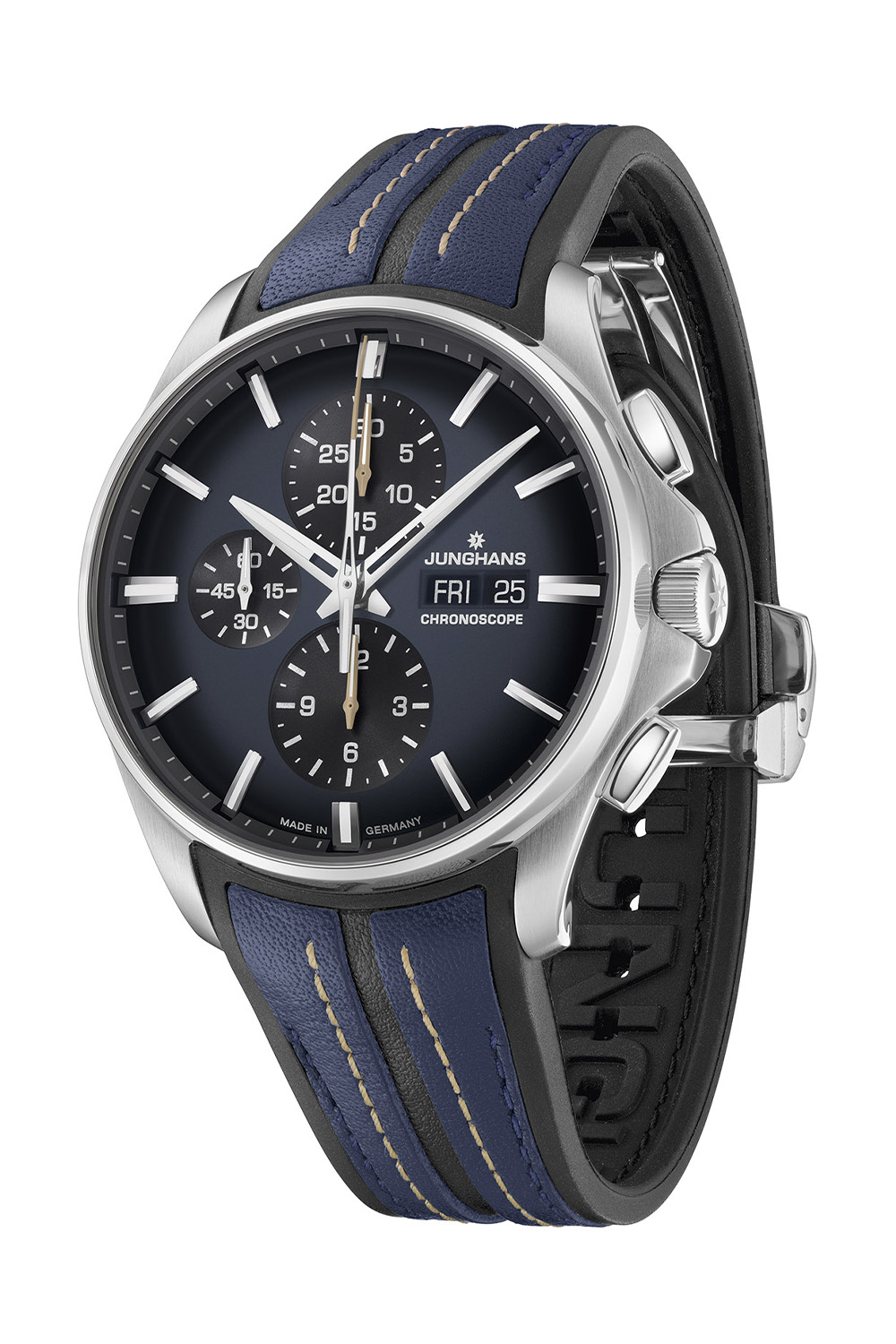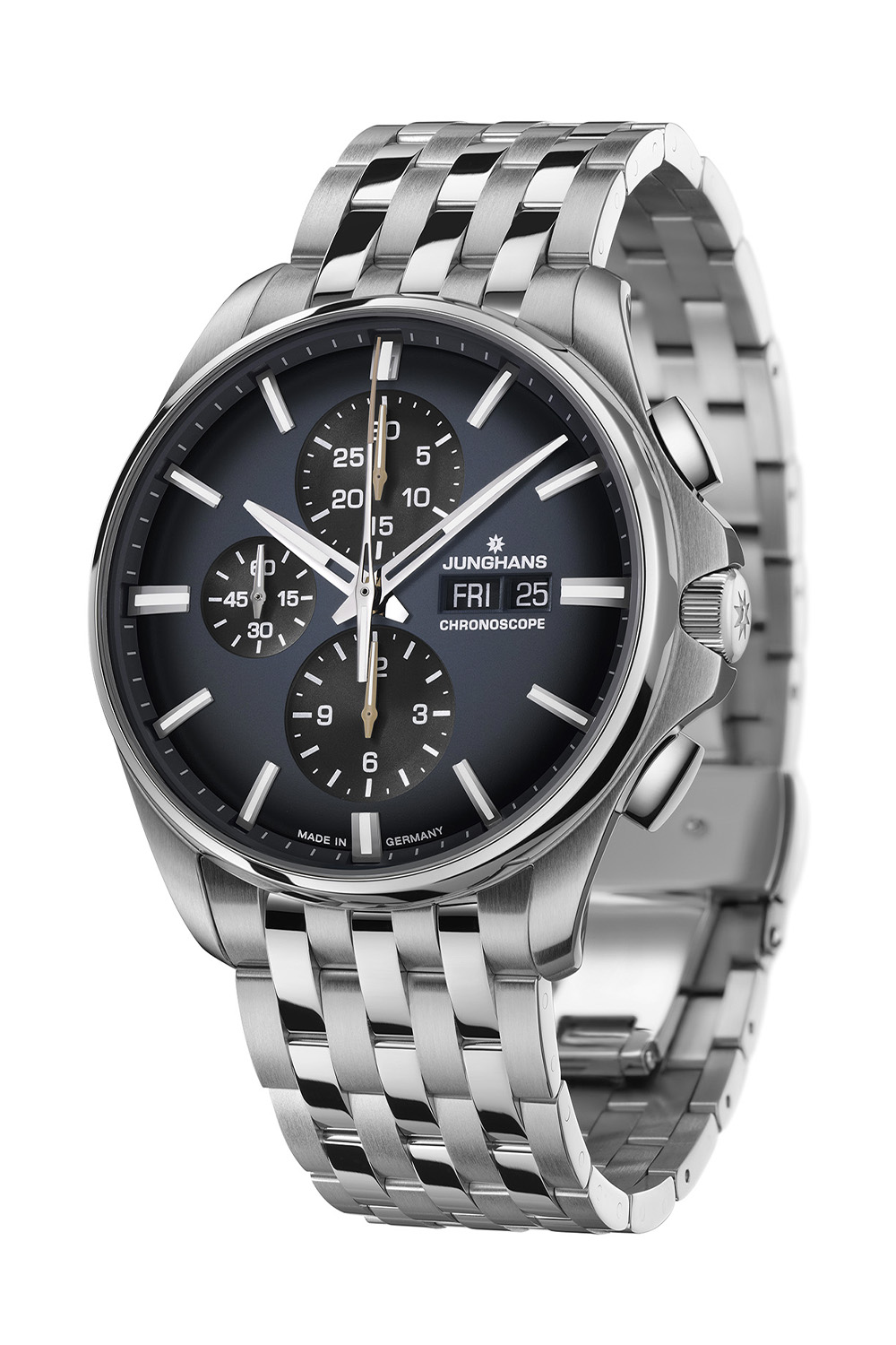 A day-date complication in English or German is positioned in a split window at three o’clock. Junghans’ name and star logo are printed above the window with “CHRONOSCOPE” printed below.