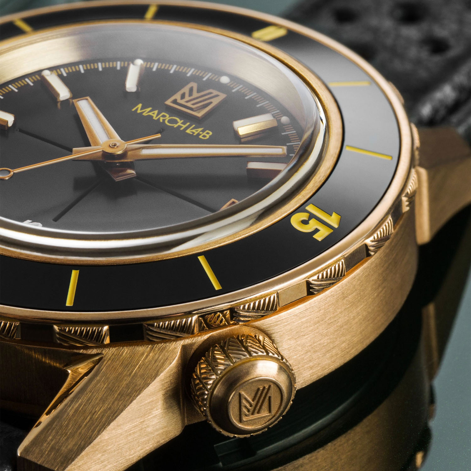 A watch already available in steel, the March LAB Belza is, specs-wise, a classic dive watch. However, while most vintage-inspired aquatic watches look back at models from the 1950s and 60s, this one has a more funky 1970s design. More angular and more robust, too, it comes with a case of 40mm, with a certain heft, at 14.5mm in thickness. The sharp lines of the case, which are made of bronze, are enhanced by brushed surfaces and discreet polished accents. As always, bronze is a living material with a warm golden colour at first, which will slowly change as it patinates.
