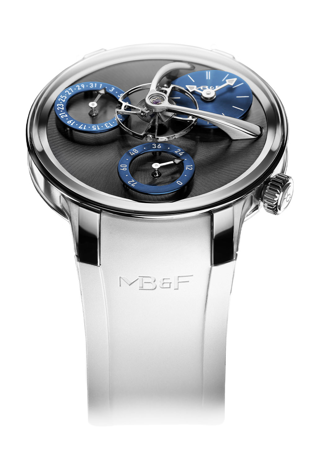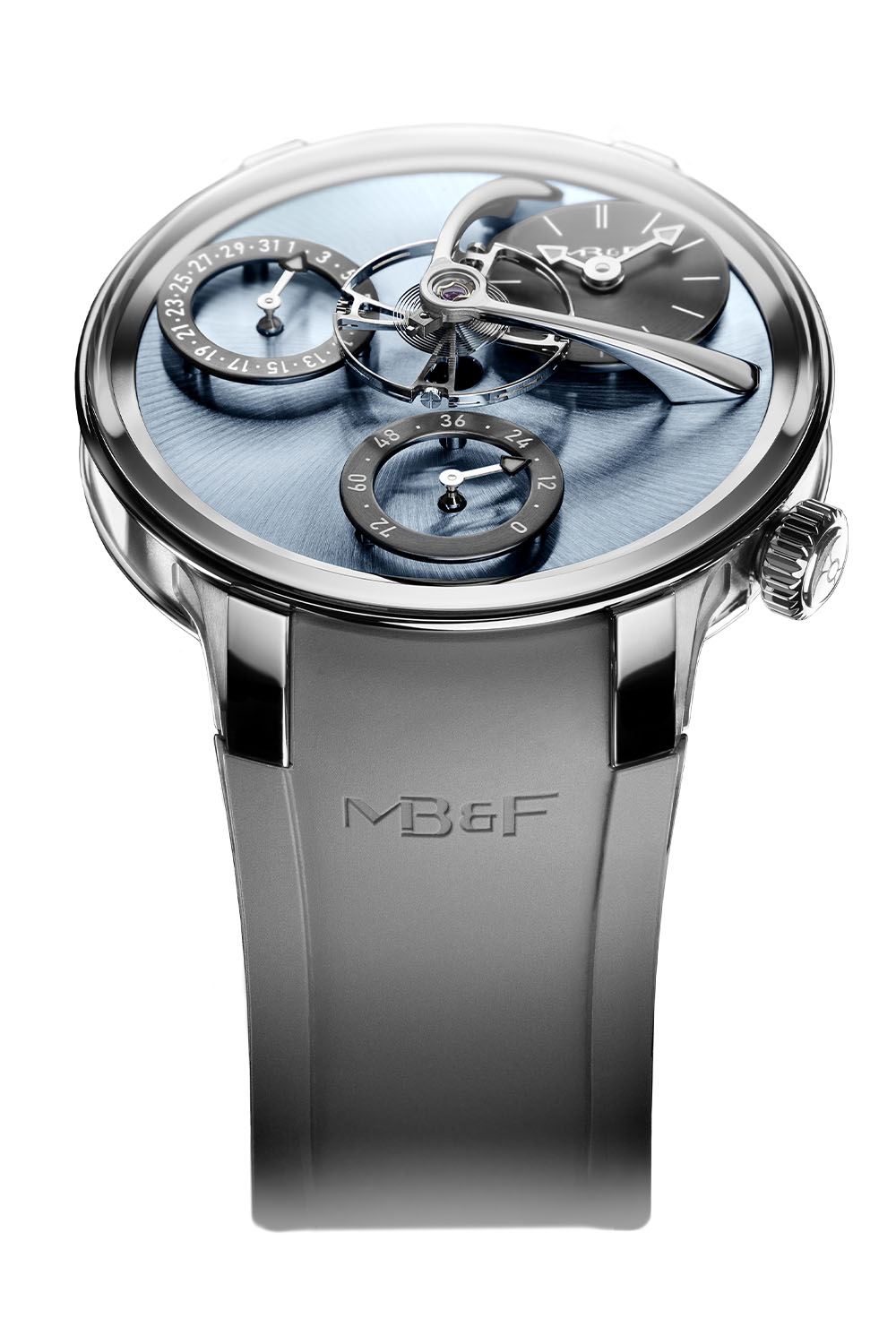 The Legacy Machine Split Escapement EVO Icy-Cool edition features an attractive pastel blue baseplate (dial) with a sunray-brushed pattern radiating from beneath the balance wheel and contrasting openworked grey counters. The 25-piece Beverly Hills edition also comes in a grade 5 titanium case, but the baseplate is black, and the three sub-dials are metallic blue to match the corporate colours of Westime, MB&F’s partner in LA, which opened the first MB&F LAB. Both are fitted with integrated rubber straps; light grey for the Icy-Cool and white for the Beverly Hills with a titanium folding buckle.