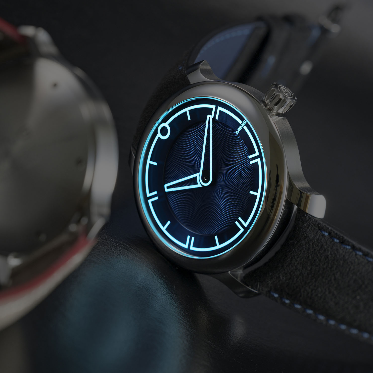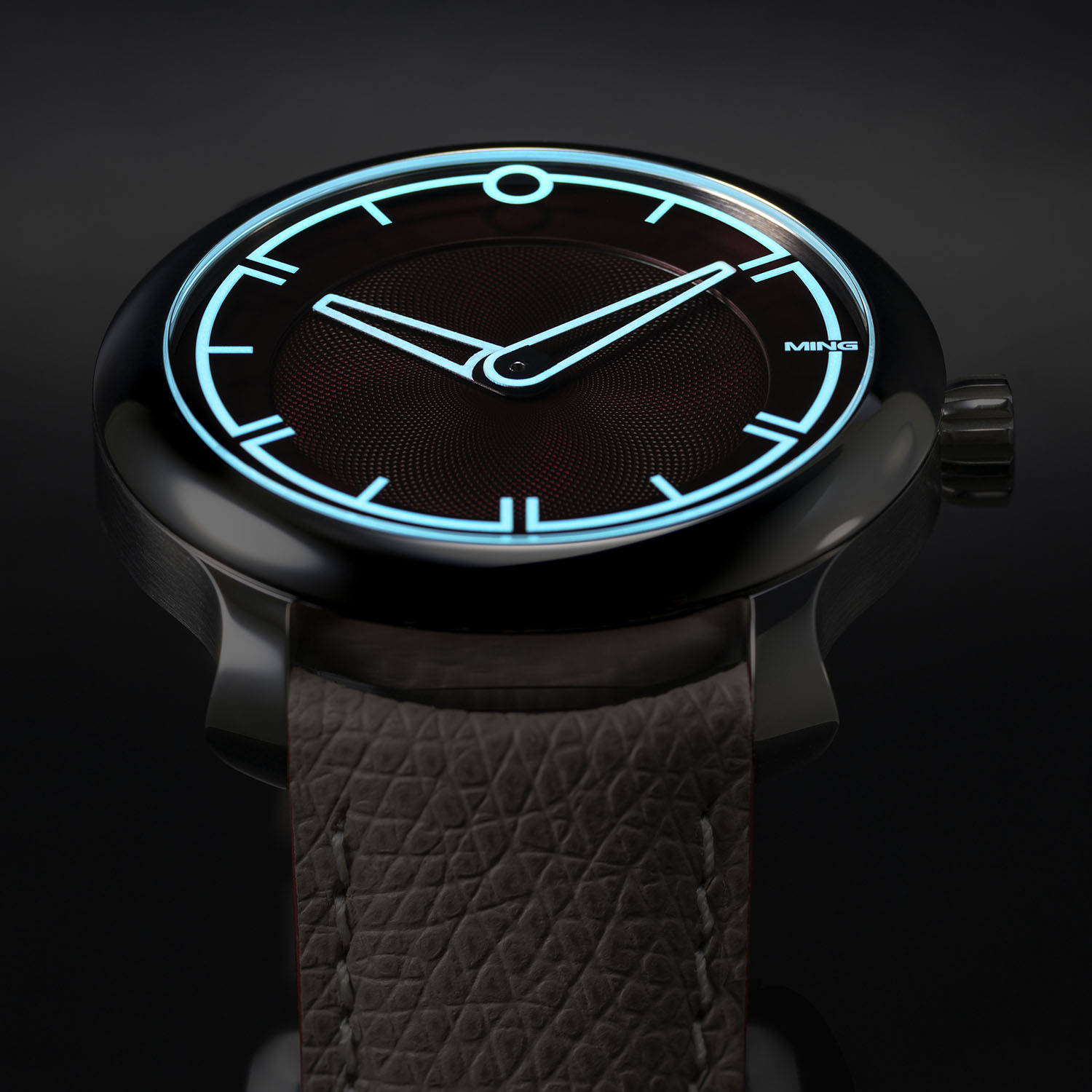 The dial of the MING 17.09 is now a two-piece construction with a fine Clous-de-Paris pattern in the centre and a circular brushed outer portion, resulting in a dynamic 3D-effect with the hands and markers floating above the dial. This feeling is even reinforced in the nighttime when all the elements, covered in Super-LumiNova, glow in light blue. The dial is available either in dark blue or burgundy red.