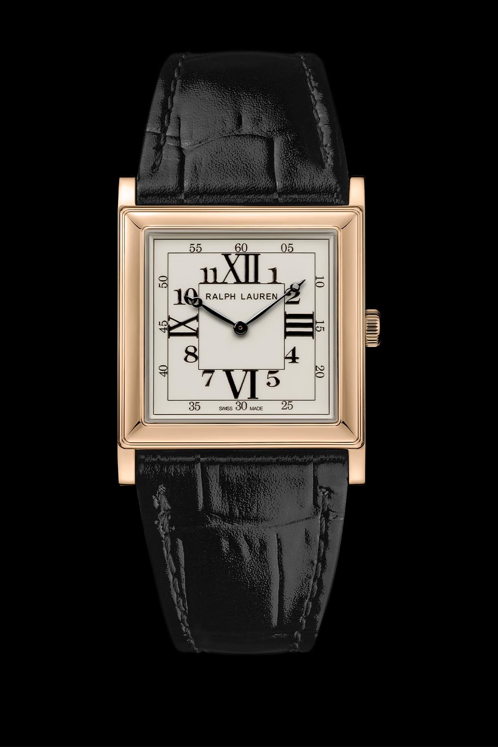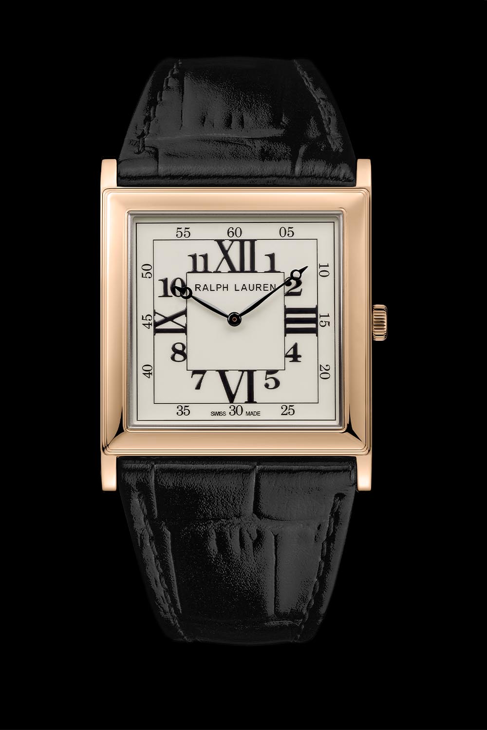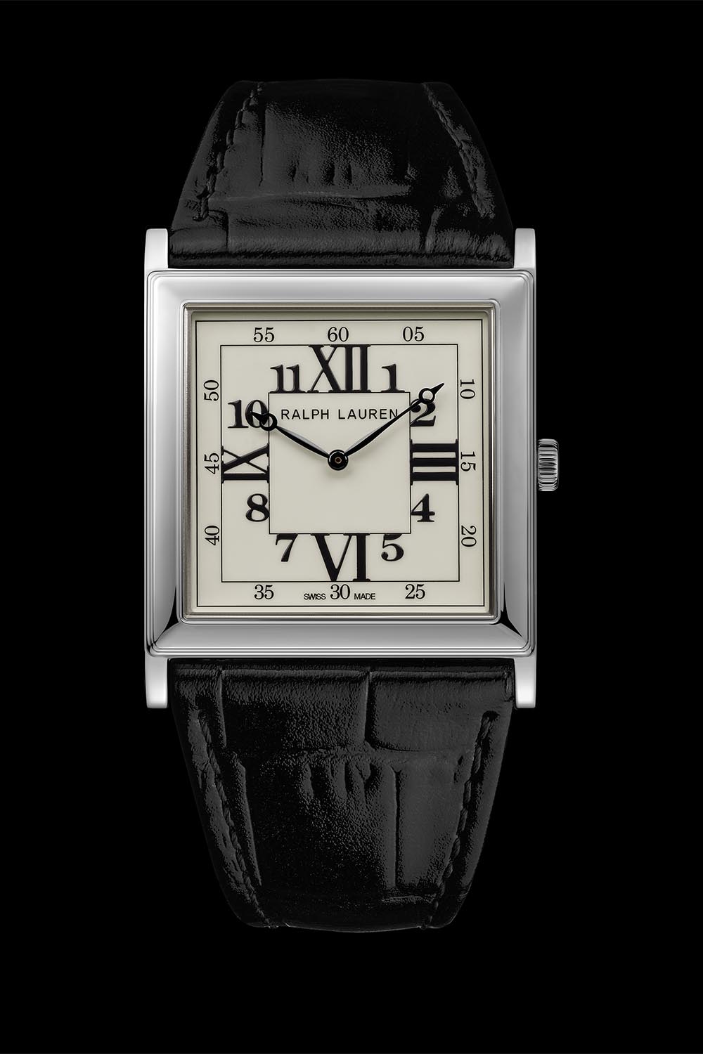 The new Ralph Lauren RL867 collection edition offers 28mm x 28mm or 32mm x 32mm case sizes, with a choice of sterling silver or rose gold case materials, both polished and with a thickness of just 5.7mm. The convex sapphire crystal has a colourless anti-reflective treatment on the inside. This is a thoughtful detail so that we can enjoy the off-white lacquered and polished dial with its mix of black printed Roman and Arabic numerals, unmarred. Black are the hour and minute hands, Breguet-style. The two concentric squares, the outer one as a minute track and the inner one to support the hour indices, complete the Art Deco look.