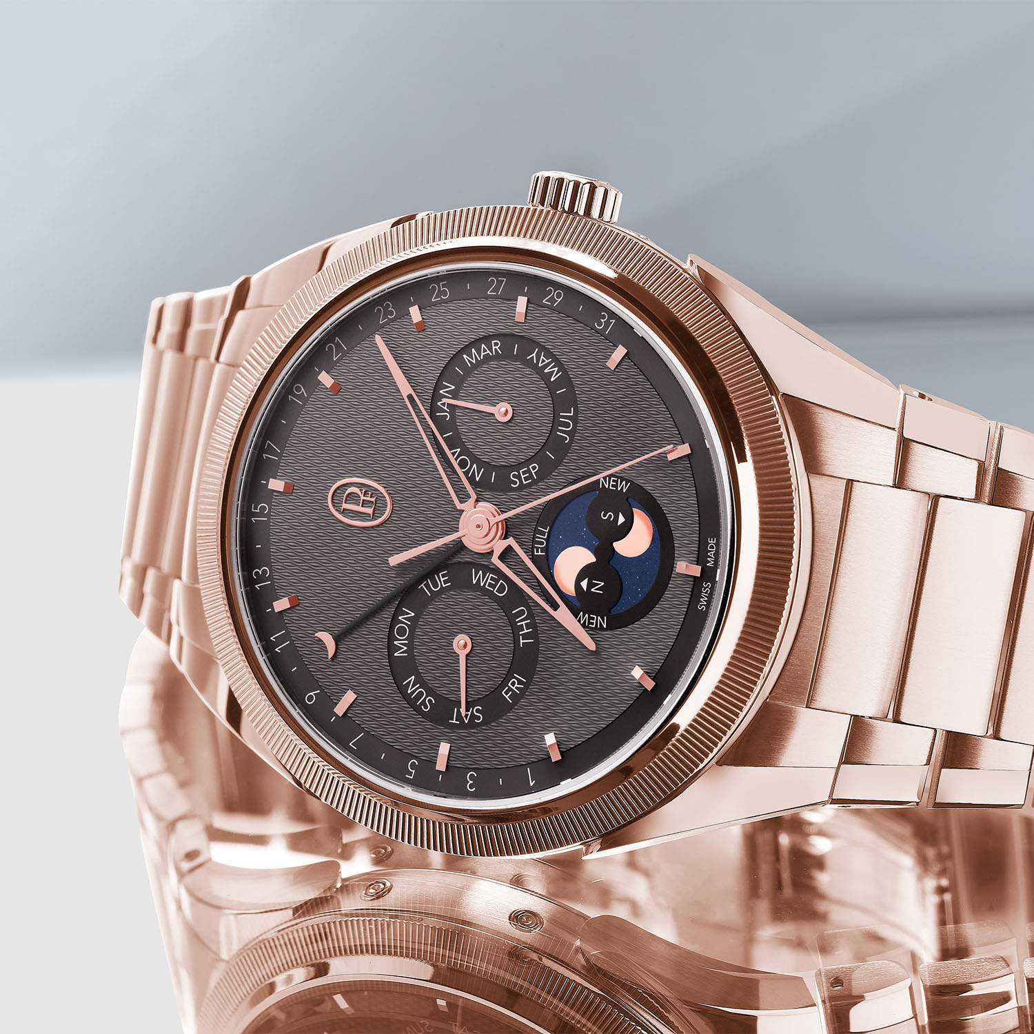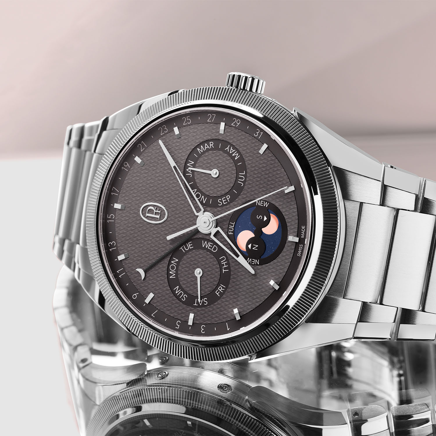 A slightly more complex vision of the concept, again with a classic movement from the brand, this annual calendar edition is housed in a 42mm case with a height of 11.1mm. Also available in steel or rose gold, its guilloché dial is warm grey and features a double moon phase and retrograde date hand. In addition, sub-counters display the weekday and the month. Inside is the automatic calibre PF339 with modular construction. Otherwise, specifications and design are identical to the versions mentioned above.