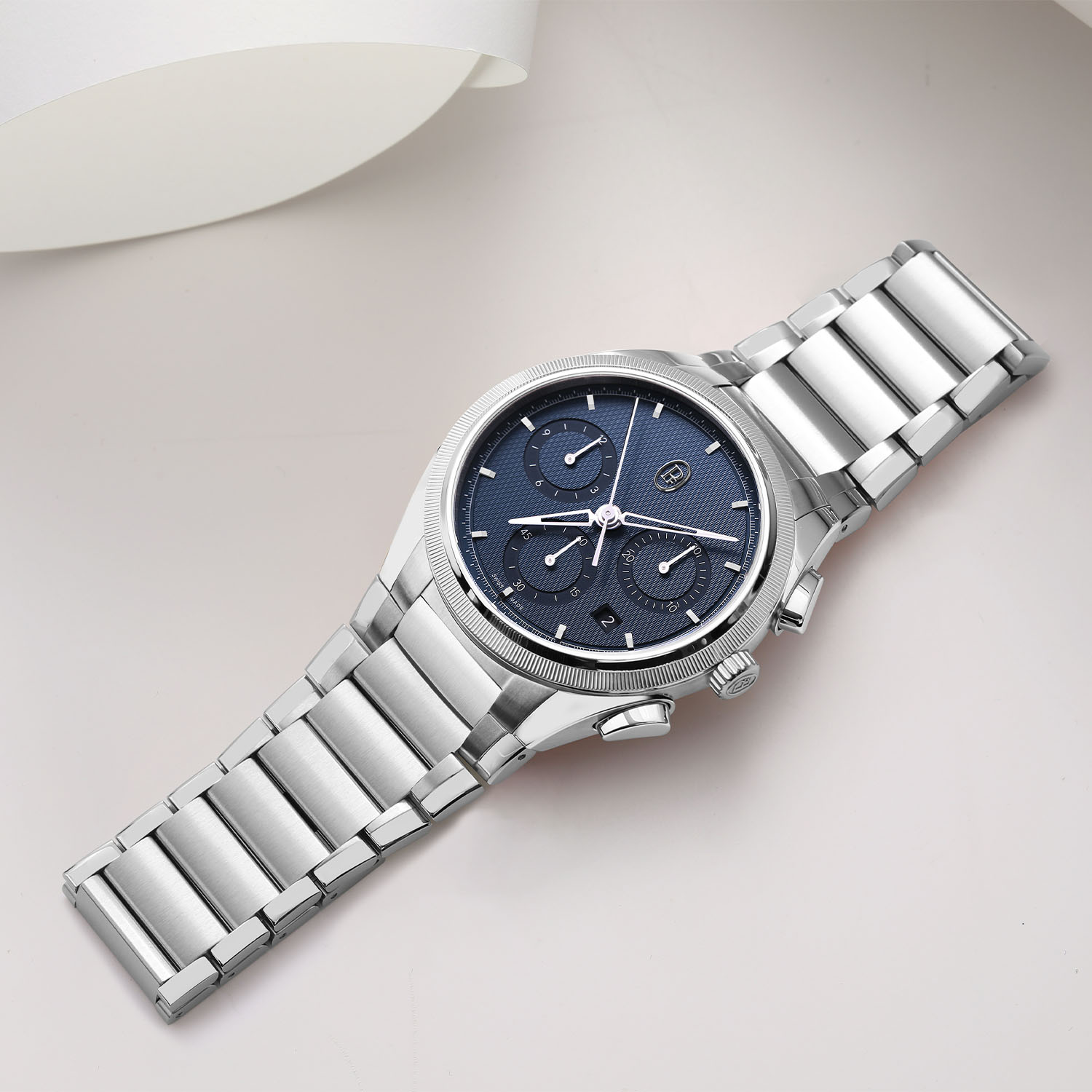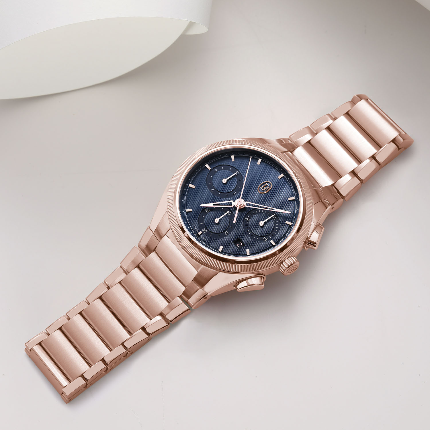 The second watch in the Tonda PF Collection is a slightly sportier take on the concept and is equipped with a chronograph movement. This edition, once again available in steel or rose gold, measures 42mm in diameter and 12.4mm in height. Still offering 100m water-resistance, it retains the same guilloché pattern on the dial but changes colour, with a deep blue tone for both the steel version and the gold model. The display is classic, with 3 sub-counters and date at 4.30.
