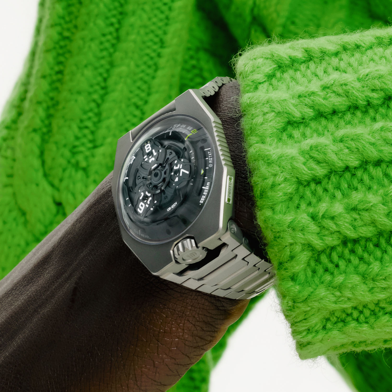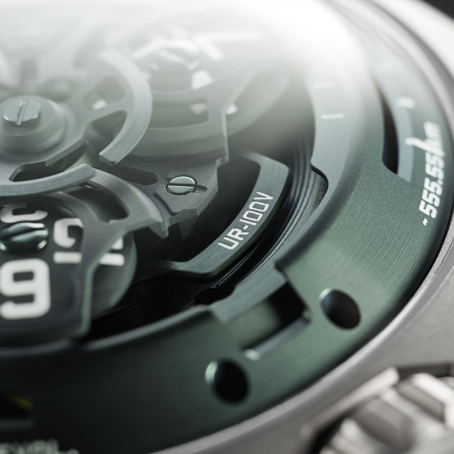 Much like the UR-100V Magic T introduced in 2023, the new Hunter Green variant emphasises the refined finishing of its “metallic ash green” sandblasted and shot-blasted titanium case, designed to interact beautifully with ambient light. The 41mm x 49.7mm case, measuring 14mm thick, stays true to the design language of the UR-100 series, featuring a crown cleverly recessed at the top (in the 12 o’clock position of a traditional watch).