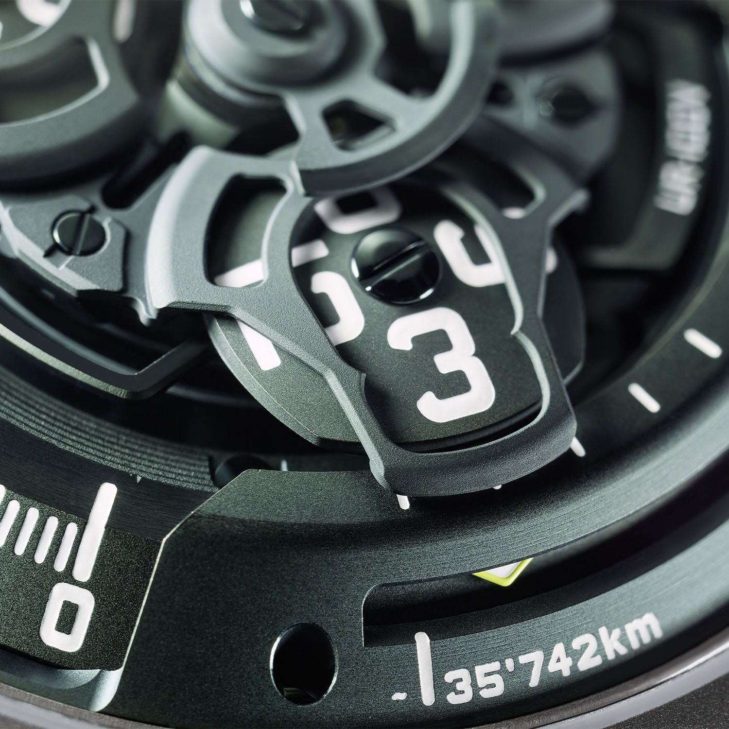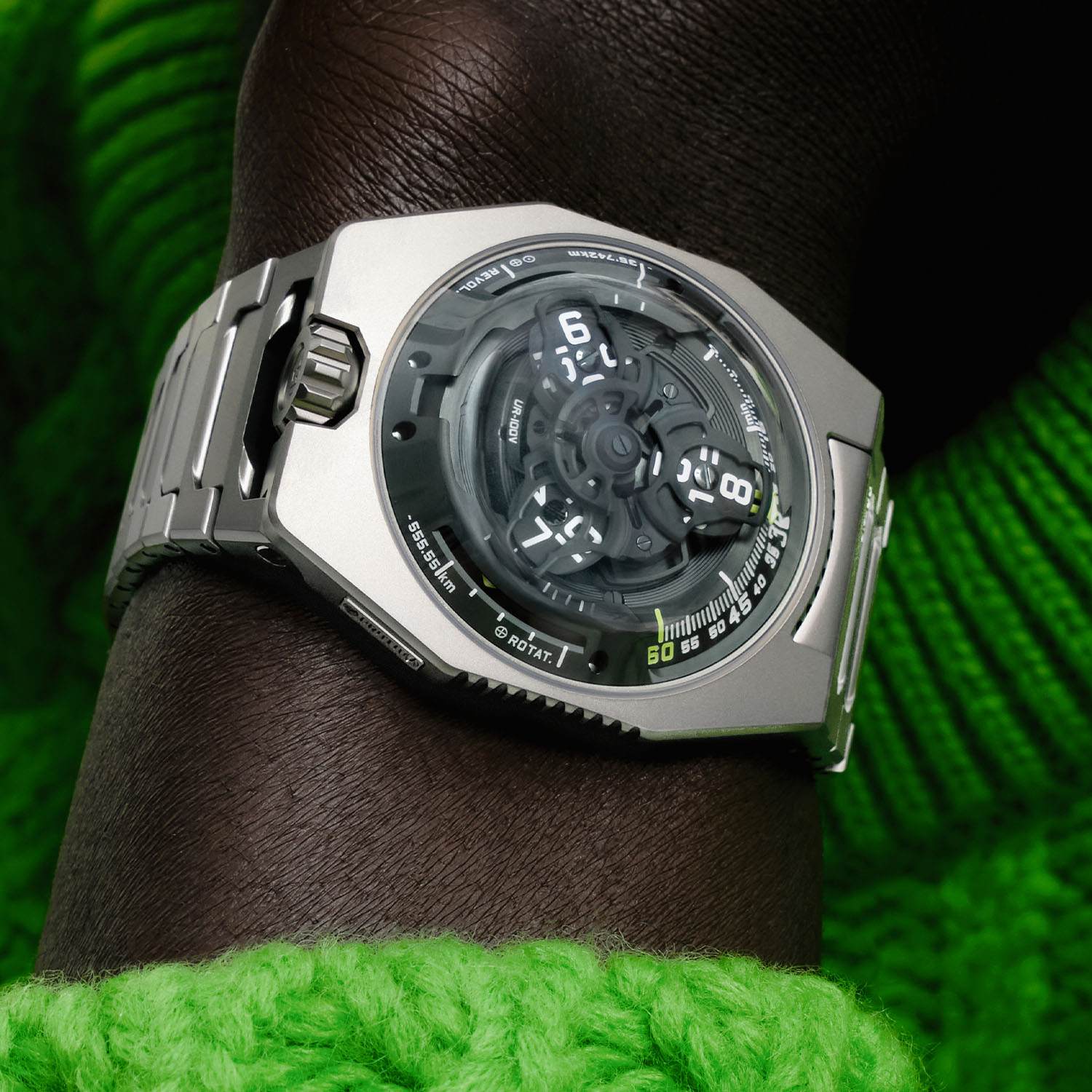 The sapphire crystal protects Urwerk’s signature satellite display, where the current hour is carried on a module that moves along a curved 120-degree track marked from 0 to 60. When the minute module reaches the green-marked “60,” it snaps back to align with the next hour satellite, ready to repeat its seamless motion for the next cycle.