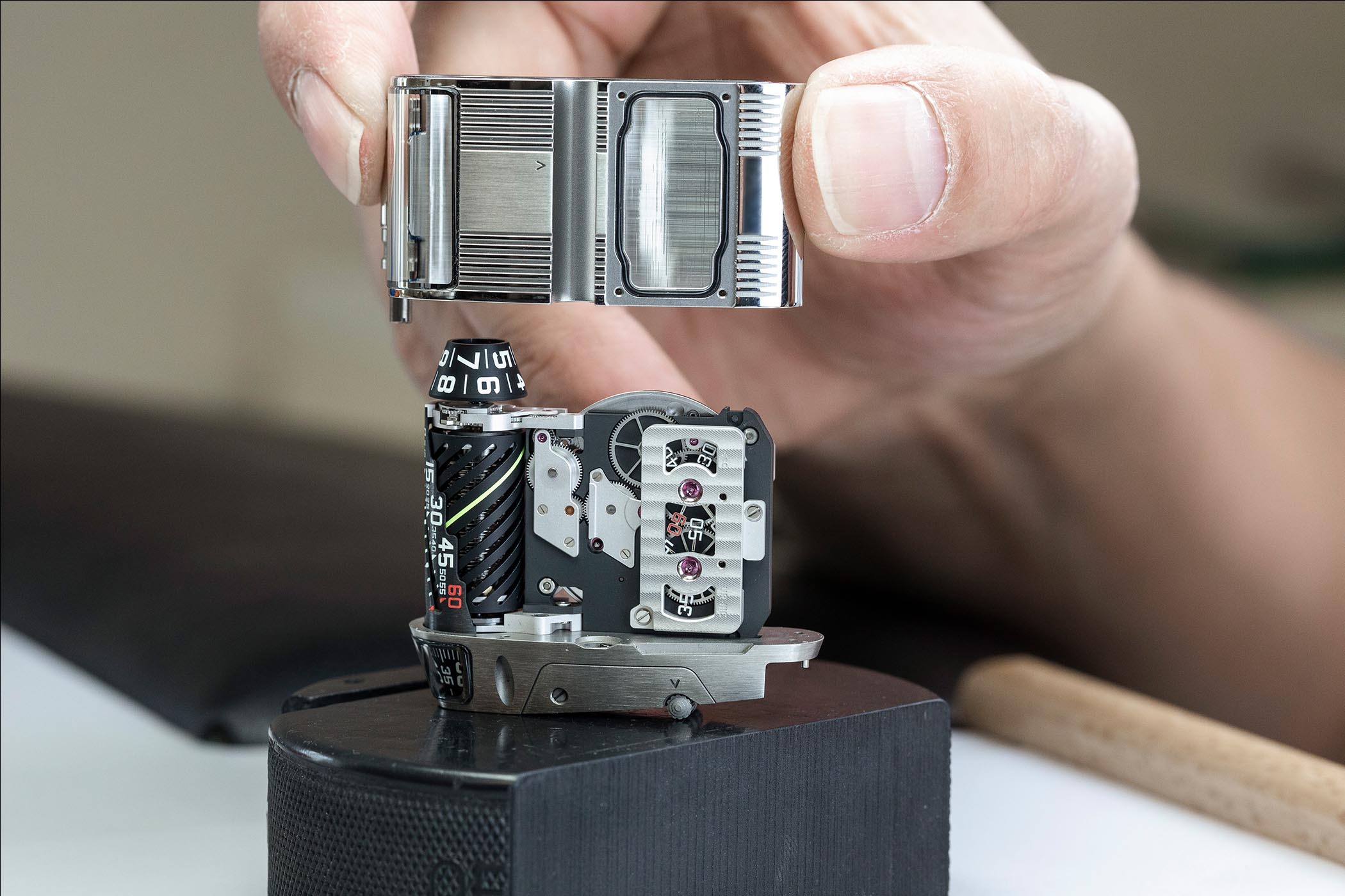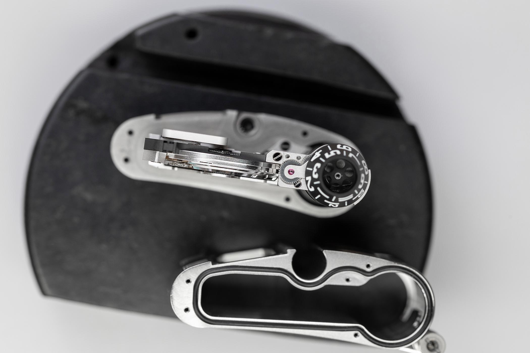 Are we done with the URWERK UR-111C? Not yet! Now comes the man-machine interaction, and the way the wearer interacts with his watch. The winding system is operated by a long fluted cylinder or “roller” integrated on the top of the case. Even though the base movement is automatic, winding the watch with this roller will be part of the pleasure. The same applies to the original way of setting the time. Instead of pulling out a crown you swing out a lever from the right side of the case and turn the roller in either direction. Considering all of these devices and unusual indication, the case can’t be assembled in a classic way – as seen above, the movement has to be slotted from the side of the case, once the panels have been removed and the time-setting lever dismantled.
