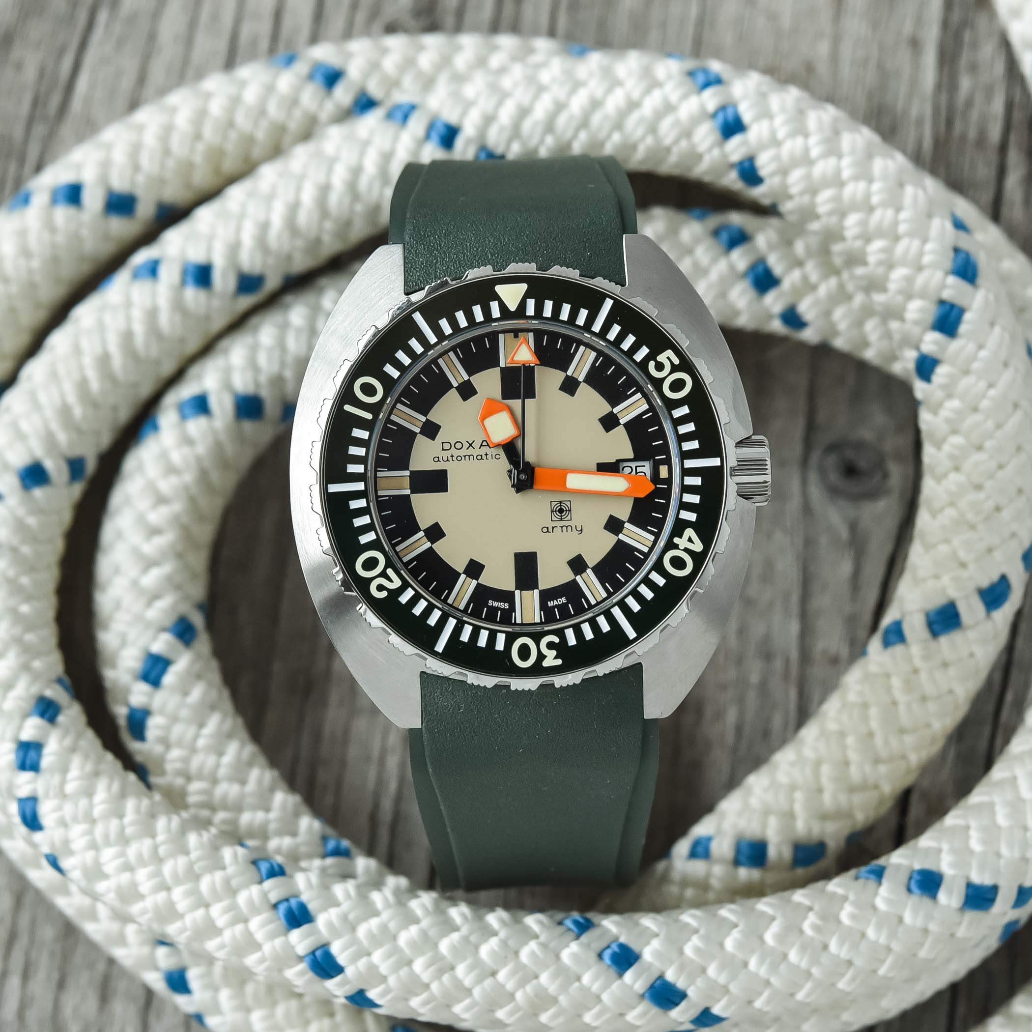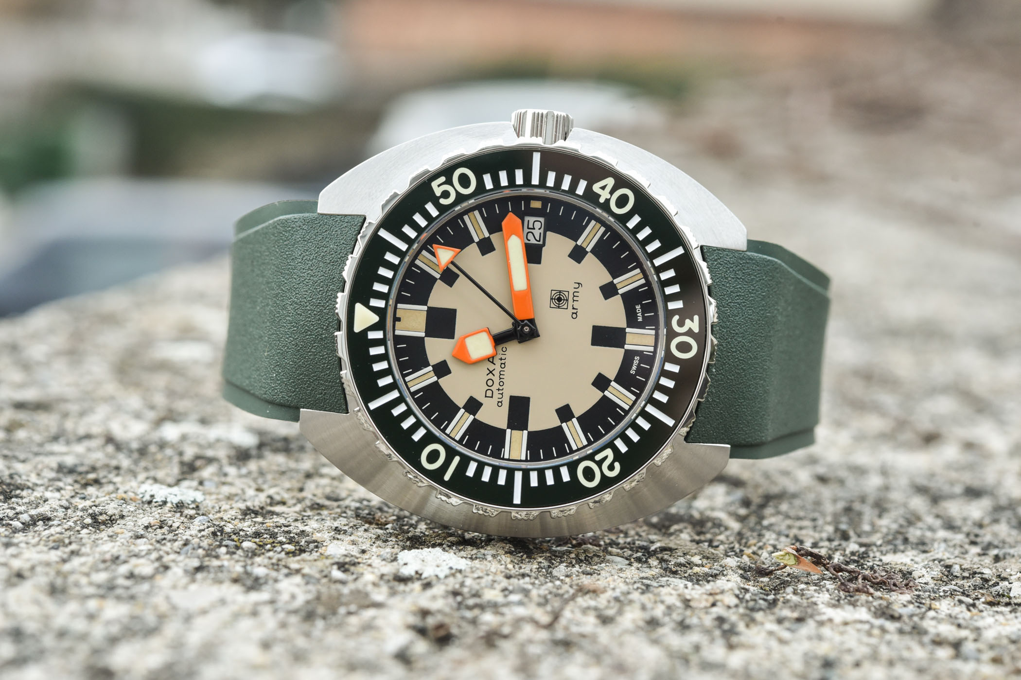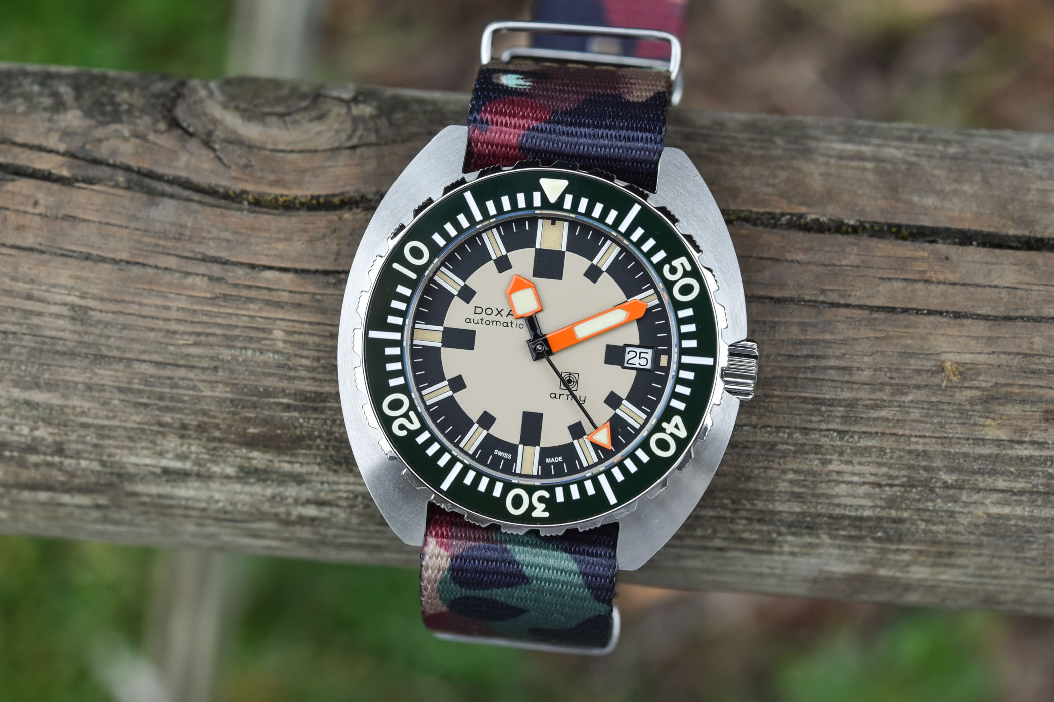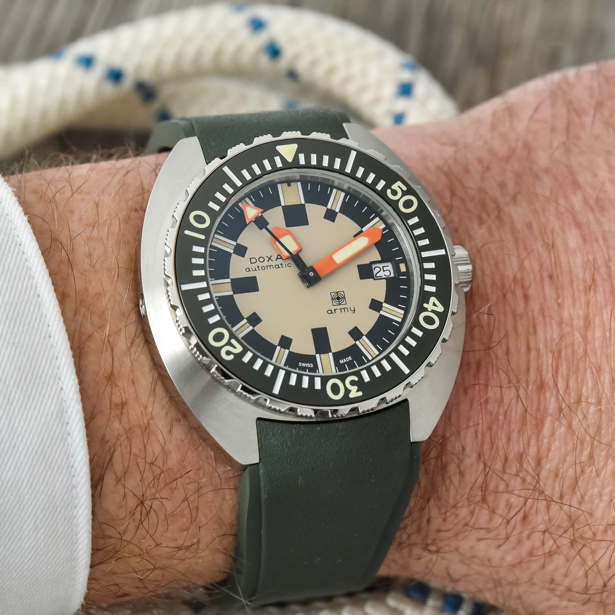 The story of the Doxa Army, as we explained it here, isn’t the easiest. it was a watch only made for professional use and never meant to be known by a wide audience. But watch collecting is what it is, and things surface and then become cult… In 1966, the Swiss Army set up a special force of military divers trained to become an elite corps. Its first member began training in 1968 and around that time the Doxa SUB 300T passed a stringent series of tests set up by the Swiss Army so the watch could become part of the standard equipment issued to its divers. In 1969, the brand and the Swiss Army jointly developed a watch based on the specifications of the SUB 300T already in use. This Doxa Army watch came with a matte black case, a countdown 60-minute matte black insert on the diving bezel, and a sand-beige dial that eliminates any risk of glare whilst ensuring excellent readability in low visibility conditions.
