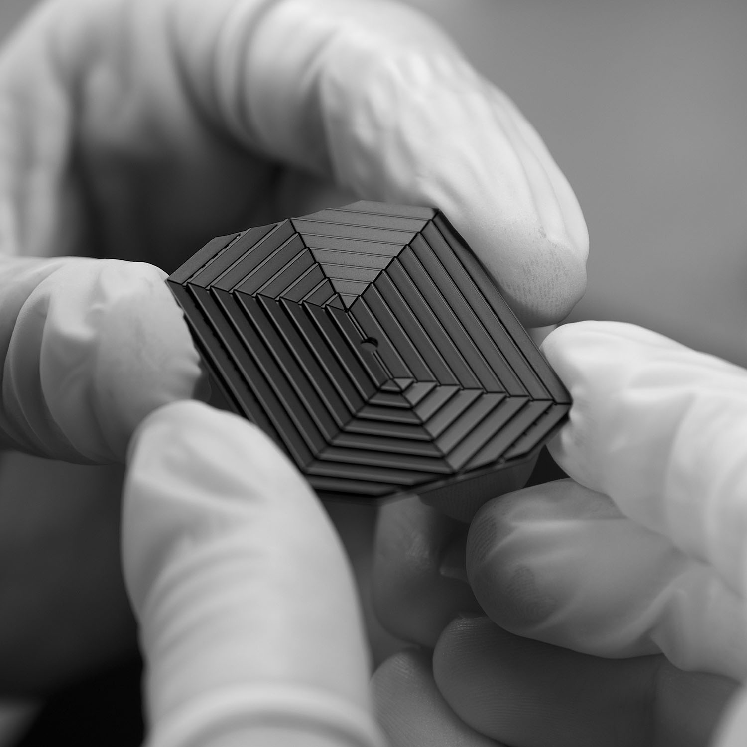 The case is, as you can see, nothing classic. Faceted, shaped and radically angular, it is made of titanium and topped by a complex sapphire crystal combining curved and faceted outer surfaces and a hemispherical inner surface. The hand-brushed case is to be considered an extension of this crystal, and despite its audacious lines, it feels surprisingly refined and elegant, with a strong sense of finesse. A sapphire back, also with lateral chamfers, adds again another perspective to this watch.