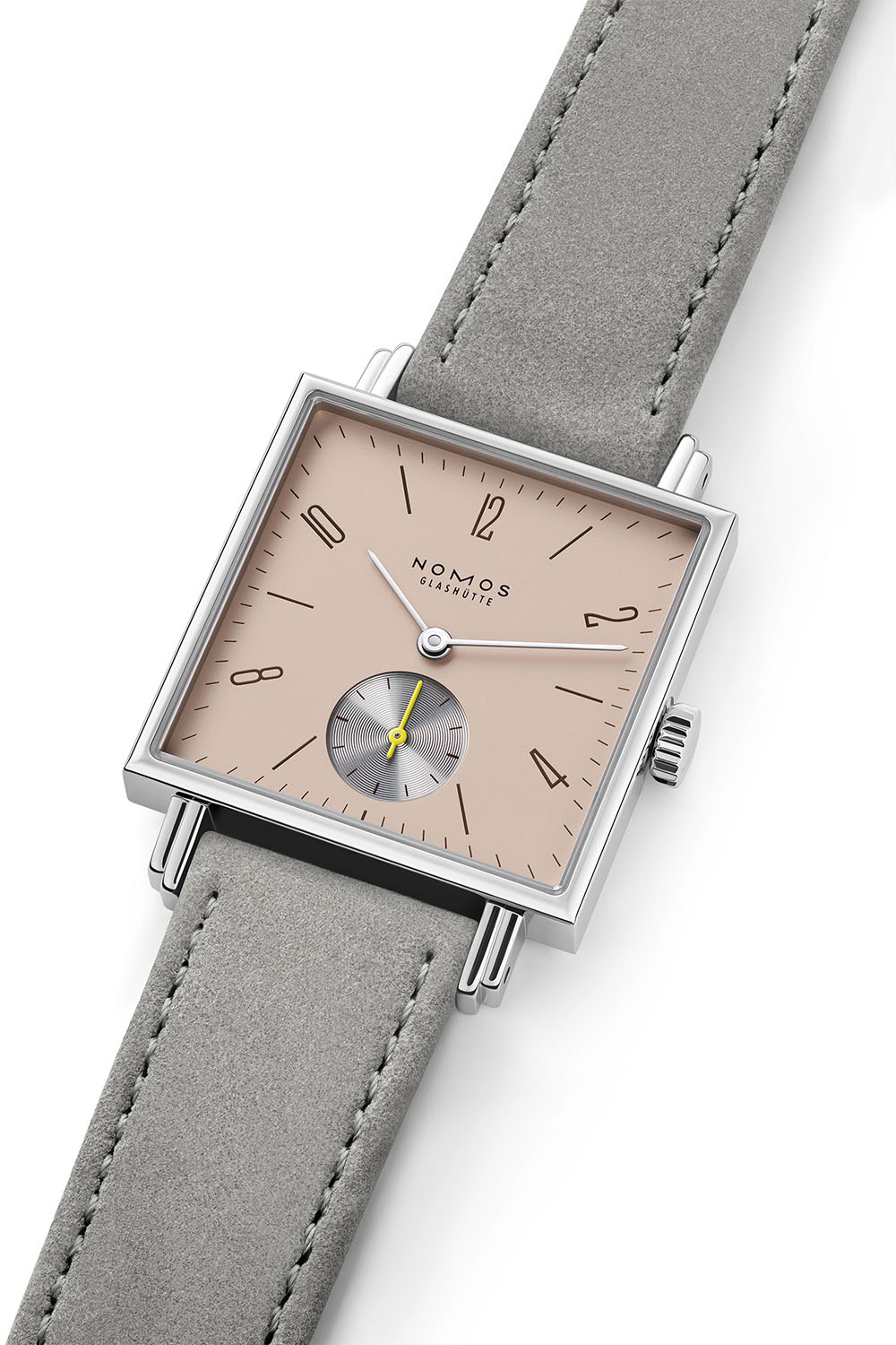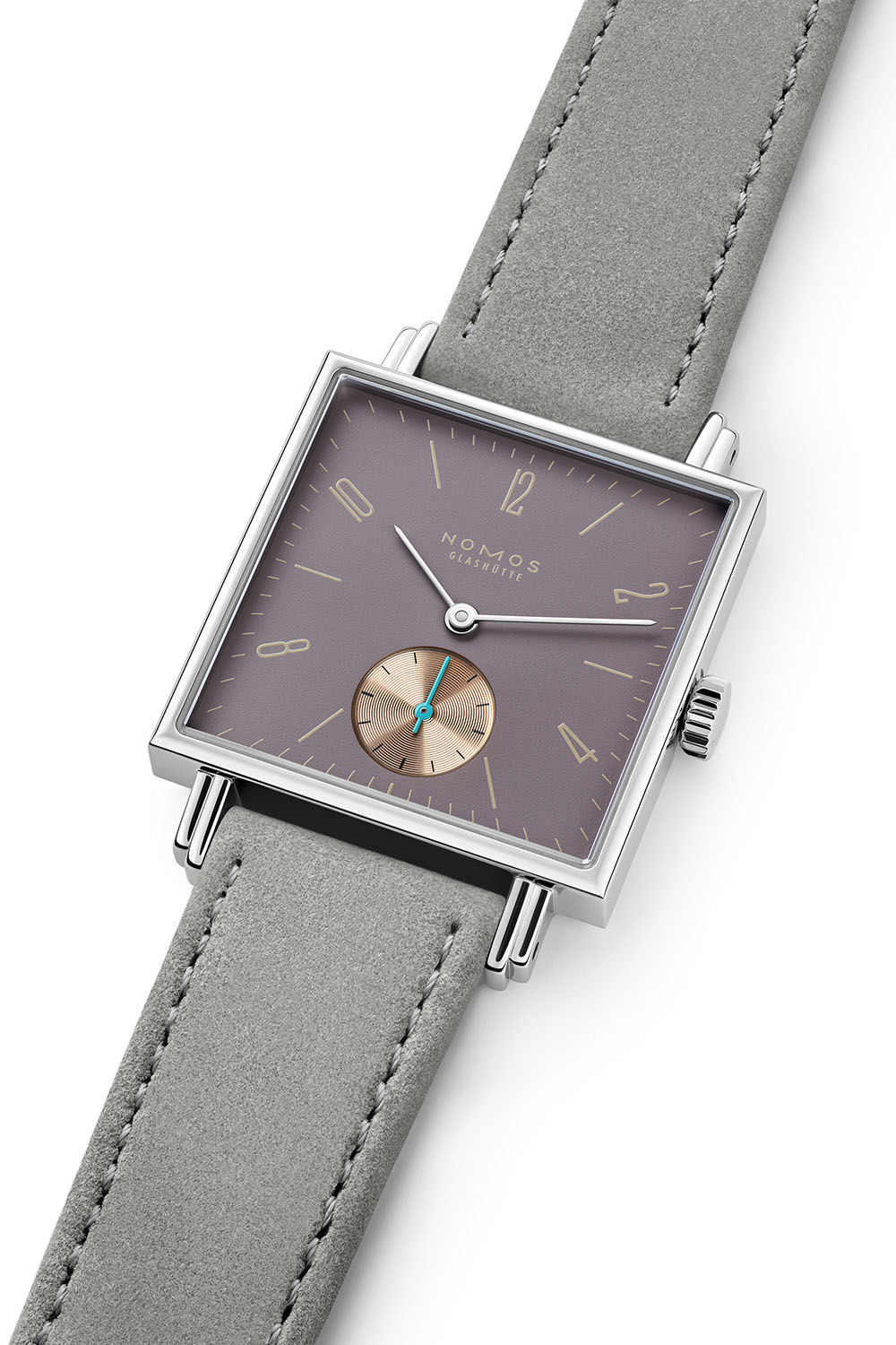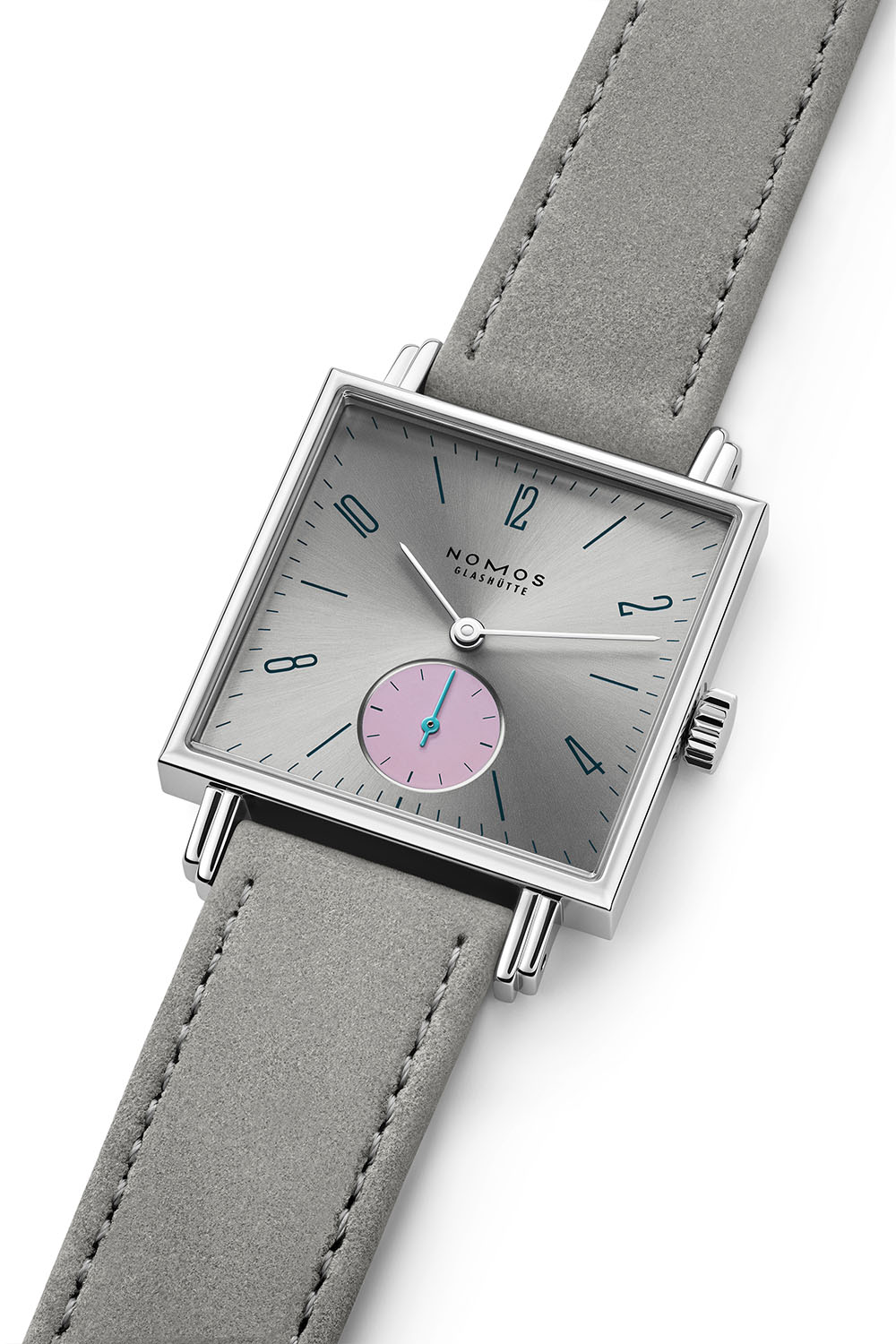 As for the rest, this collection is classic in specs. The squared case measures 29.5mm x 29.5mm, or 0.000841 square meters if you want to be different, with a slender height of 6.3mm. Made of polished steel, a sapphire crystal protects the dial, and the caseback can be closed or equipped with a sapphire crystal to see the movement. All four models in this new Nomos Tetra collection are worn on straps made of vegan velour in grey, closed by a steel pin buckle.