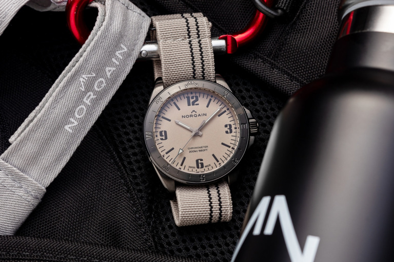 In 2020 Norqain announced a partnership with movement manufacturer Kenissi (jointly owned by Chanel and Tudor/Rolex), meaning that many of its watches are now ticking to high-performance chronometer-certified movements with powerful 70-hour fuel tanks. The Kenissi COSC-certified calibre NN20/1 has a sturdy construction to ensure the movement is protected during high-impact sports. The movement in this new Norqain Adventure Neverest GMT has a jumping hour mechanism to set the local time and change the date forwards or backwards at any time of the day without losing a second. The sapphire crystal caseback reveals Norqain’s double-N logo on the rotor. Beating a frequency of 28,800vph, the barrel can store up to 70 hours of power reserve.