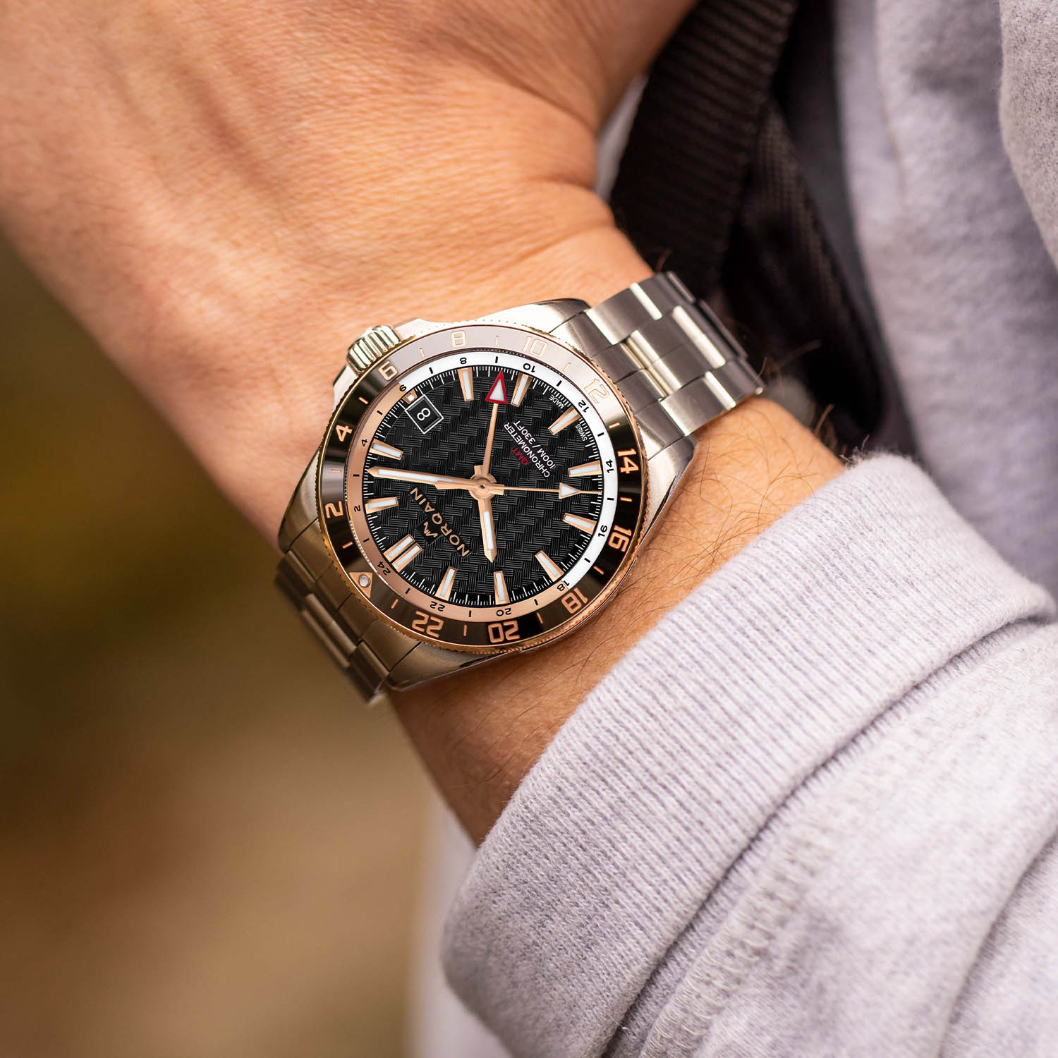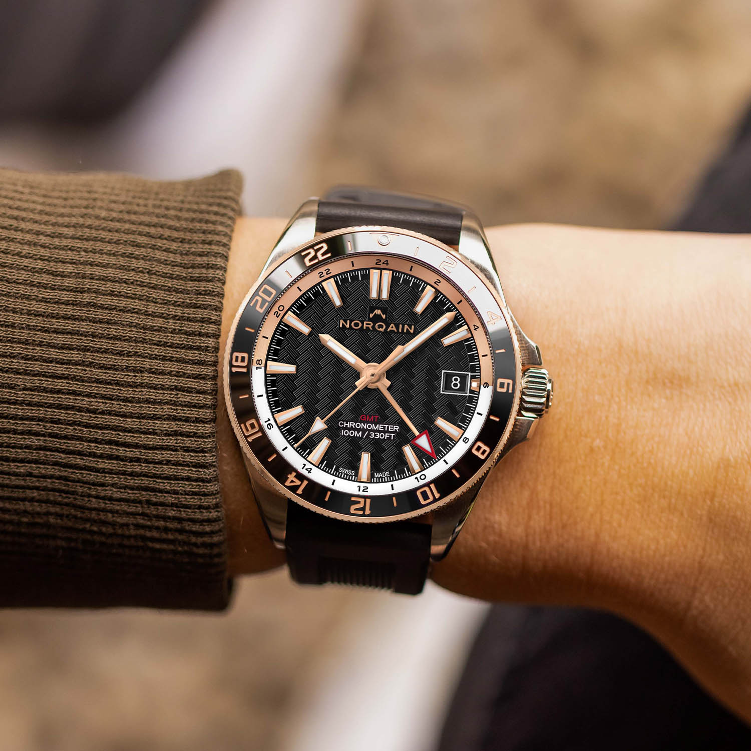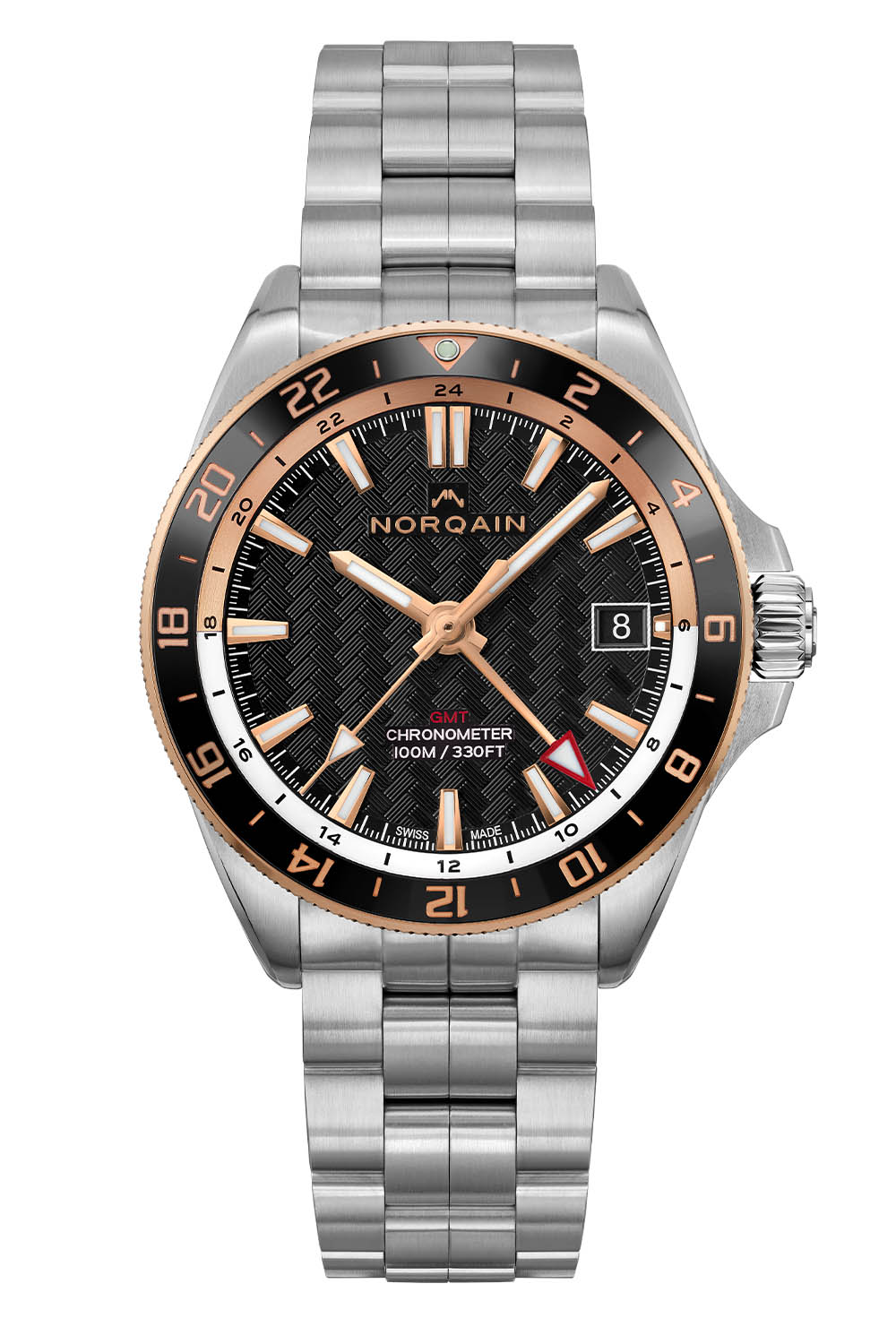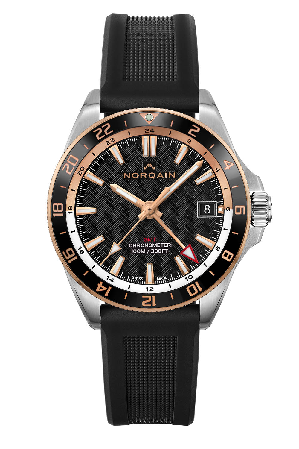 The two-tone 18k 5N red gold bezel with its black ceramic ring sets this model apart. Knurled to ensure a better grip, the bi-directional rotating bezel has a 24-hour scale picked out in gold and a pip of lume in the triangle at noon (24). Attractive and legible, the two-tone black and gold colour scheme follows onto the dial with its black background decorated with Norqain’s hallmark weave pattern. The generous gold-coloured indices are faceted, polished and applied by hand to the dial. Like the hands, they are coated with X1 Super-LumiNova, which is 60% more luminous than standard Super-LumiNova. The golden triangular tip of the central seconds hand is also filled with lume, as is the larger red triangular-tipped hand for the GMT. A two-tone internal flange with a 24-hour scale signals night-time hours in gold and daytime hours in white, and the date window is positioned at 3 o’clock with a black background to match the dial colour.