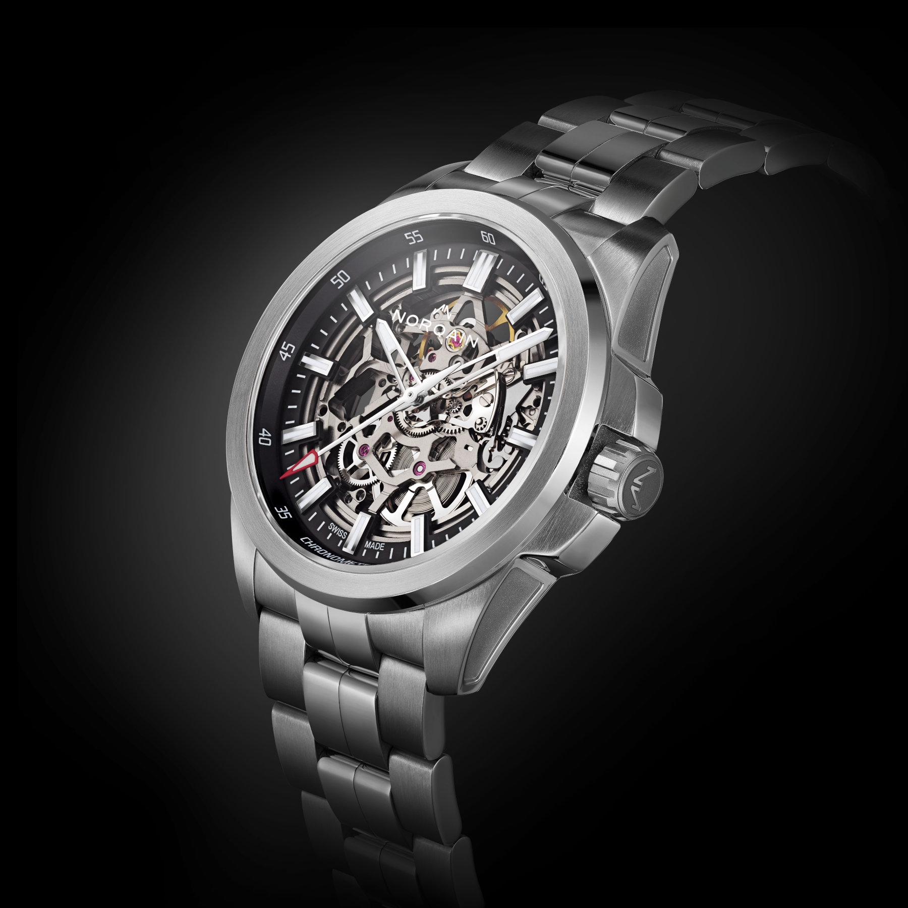 Lacking a traditional dial, the Norqain Independence 22 Skeleton comes with a transparent (most likely sapphire crystal, but this is unconfirmed) dial. On top, we find applied and faceted indices with Super-LumiNova. These indices are connected to a white-on-black chapter ring, framed by a sloped flange with a 5-minute scale. The central hour and minute hands are skeletonized in the lower half and have a Super-LumiNova insert in the upper half. The central seconds hand has a triangular tip with Super-LumiNova, outlined in red.