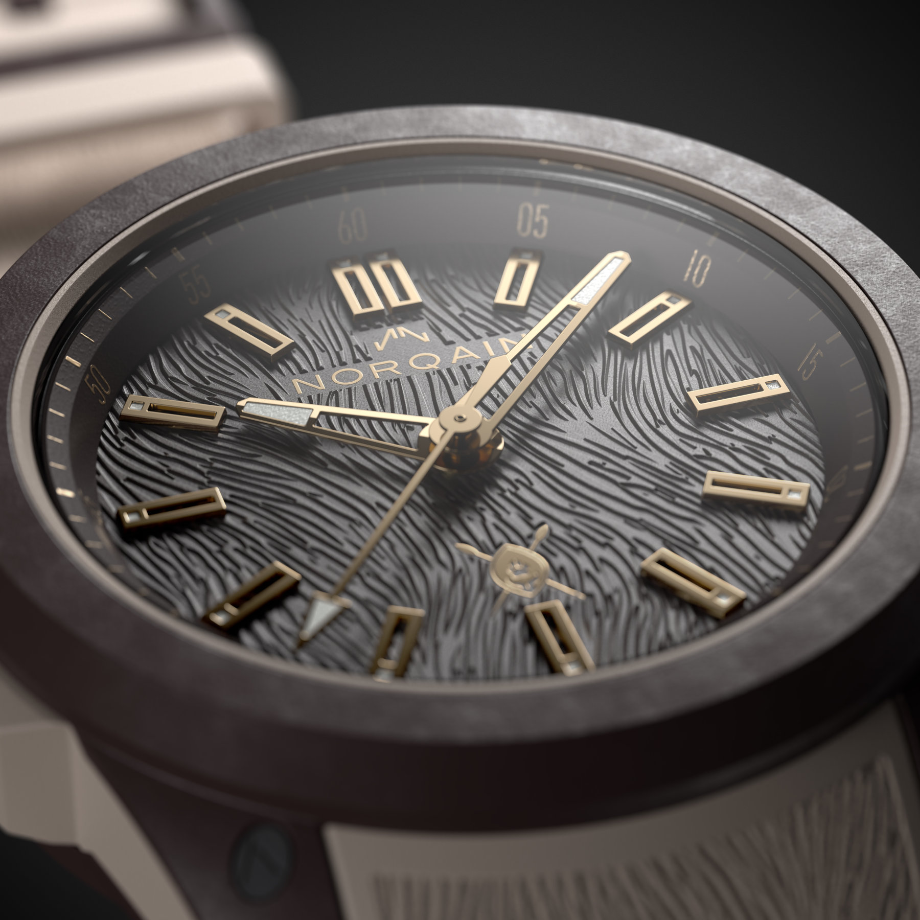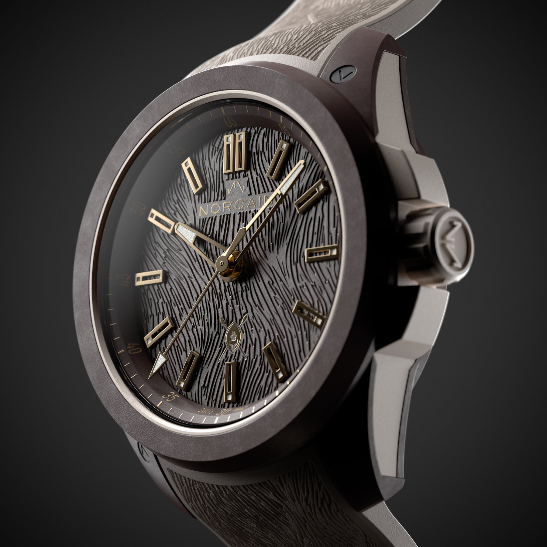 The case features double anti-reflective and scratch-resistant sapphire crystals on both sides. The crown, encased in sand-coloured rubber and protected by guards, is adorned with the Norqain logo. The sand-themed design extends to the dial, stamped with a lion fur pattern and the sanctuary’s logo. The flat hour indices, faceted hour and minute hands, and seconds hand are diamond-cut and plated in red gold, with white X1 Super-LumiNova treatment for enhanced visibility in low-light conditions.