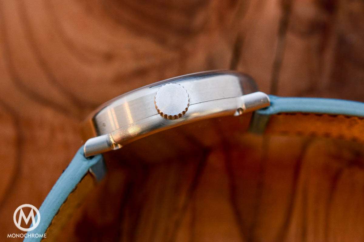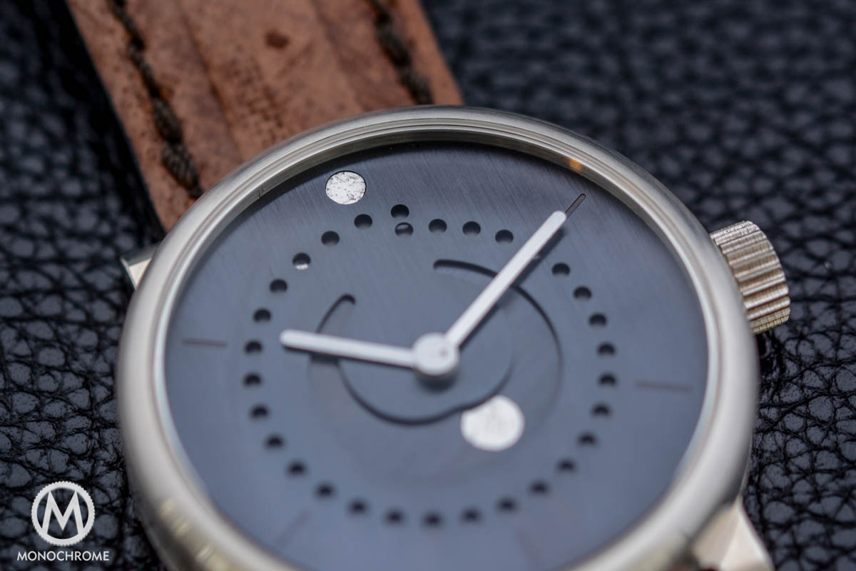 That’s more along the lines of ochs und junior customisations. Pure, raw, no frills, the bare essence. When you look close you can still see the pattern of the drill on the Sterling silver case. There’s no finishing, at least not as we’re used to from any of the other brands in the business. The you can see on ochs und junior watches is not what you would expect from a watch brand. As said, a rusted dial is an option, or a hand-patinated brass dial or you can take it a few steps further like the ‘nebra wild‘.