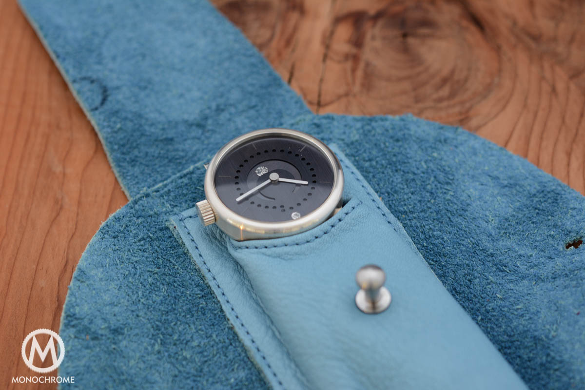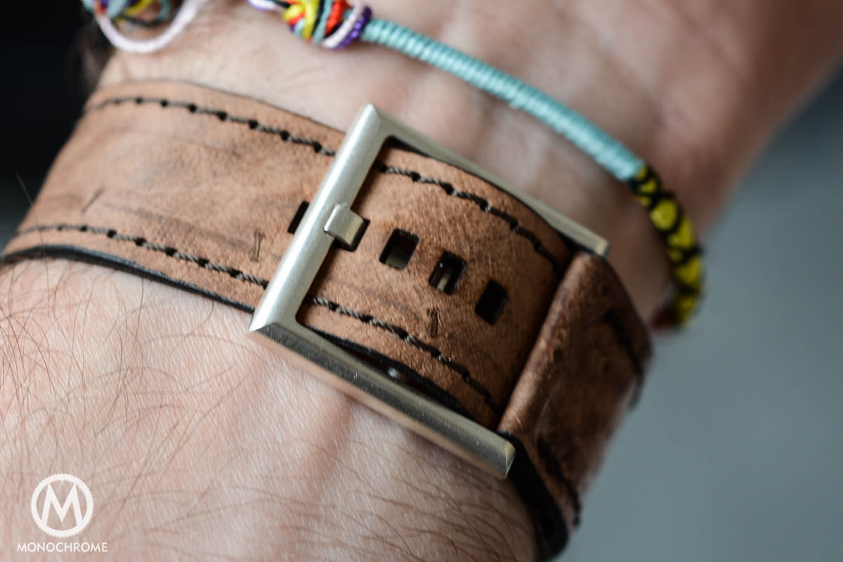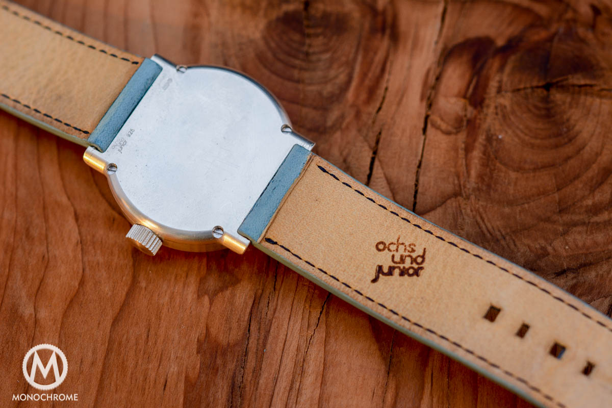 The 22mm wide strap adds a ‘strong’ and robust feeling to the medium sized watch. It is closed by the ochs und junior buckle, which is different from all other buckles. Most traps have loops for securing the strap end. The extra-wide opening enables you to tuck the end of the strap inside against your wrist.