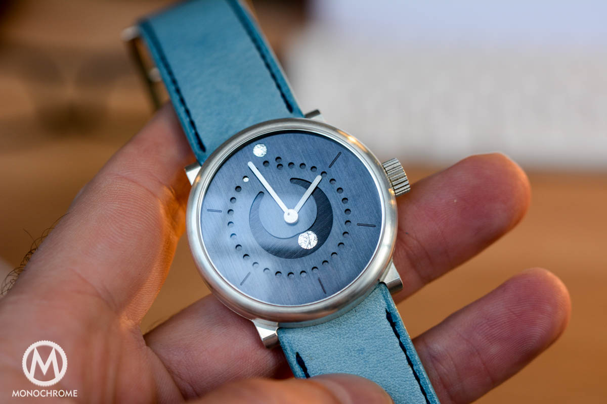 The new ochs und junior moon phase blue patina, in a Sterling silver case, and with platinum hands, full moon, sun and date dot, is a breath of fresh air in the sometimes gushy world of watches. I loved wearing it, and loved the luster of the Sterling silver case. It certainly gets the Monochrome stamp of approval! More info and all sales are directly through the website: www.ochsundjunior.ch