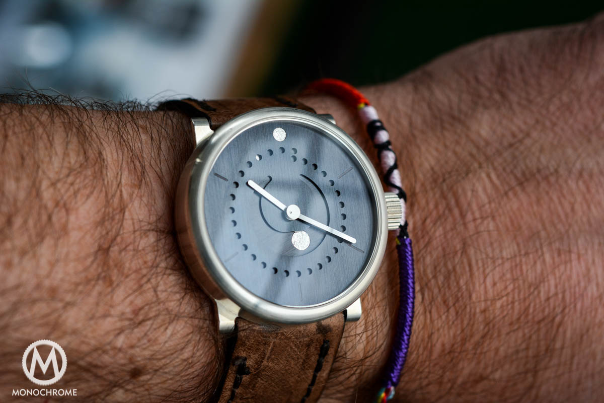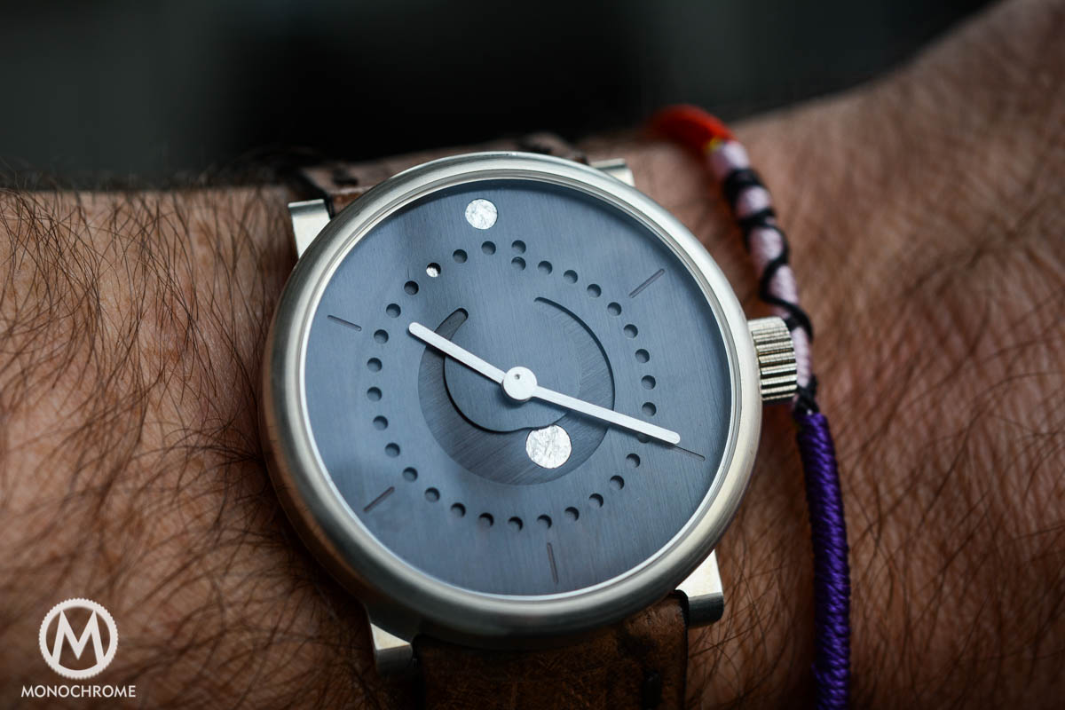 On the wrist: ochs und junior moon phase (blue patina) 39mm silver case