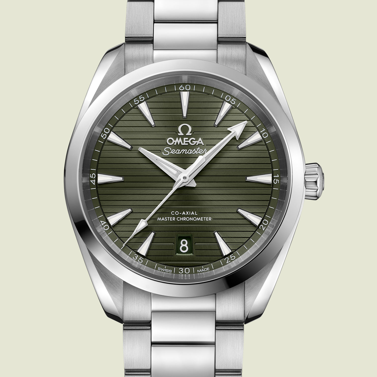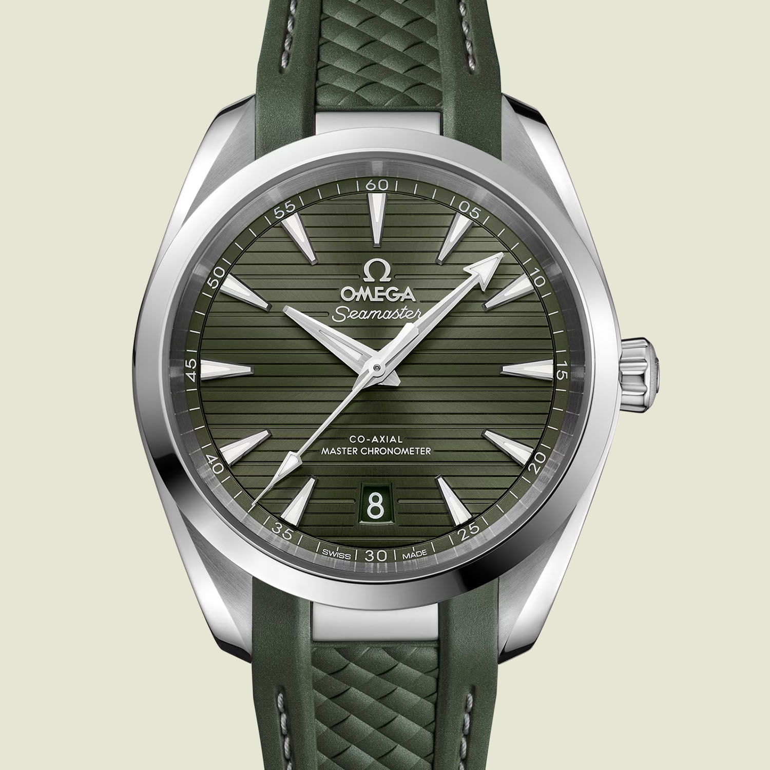 As with the 41mm edition, the green 38mm Seamaster Aqua Terra 150m is available on a brushed/polished 3-link stainless steel bracelet with a folding clasp or an integrated, structured green rubber strap with grey stitching and fold-over clasp (lug width 19mm).