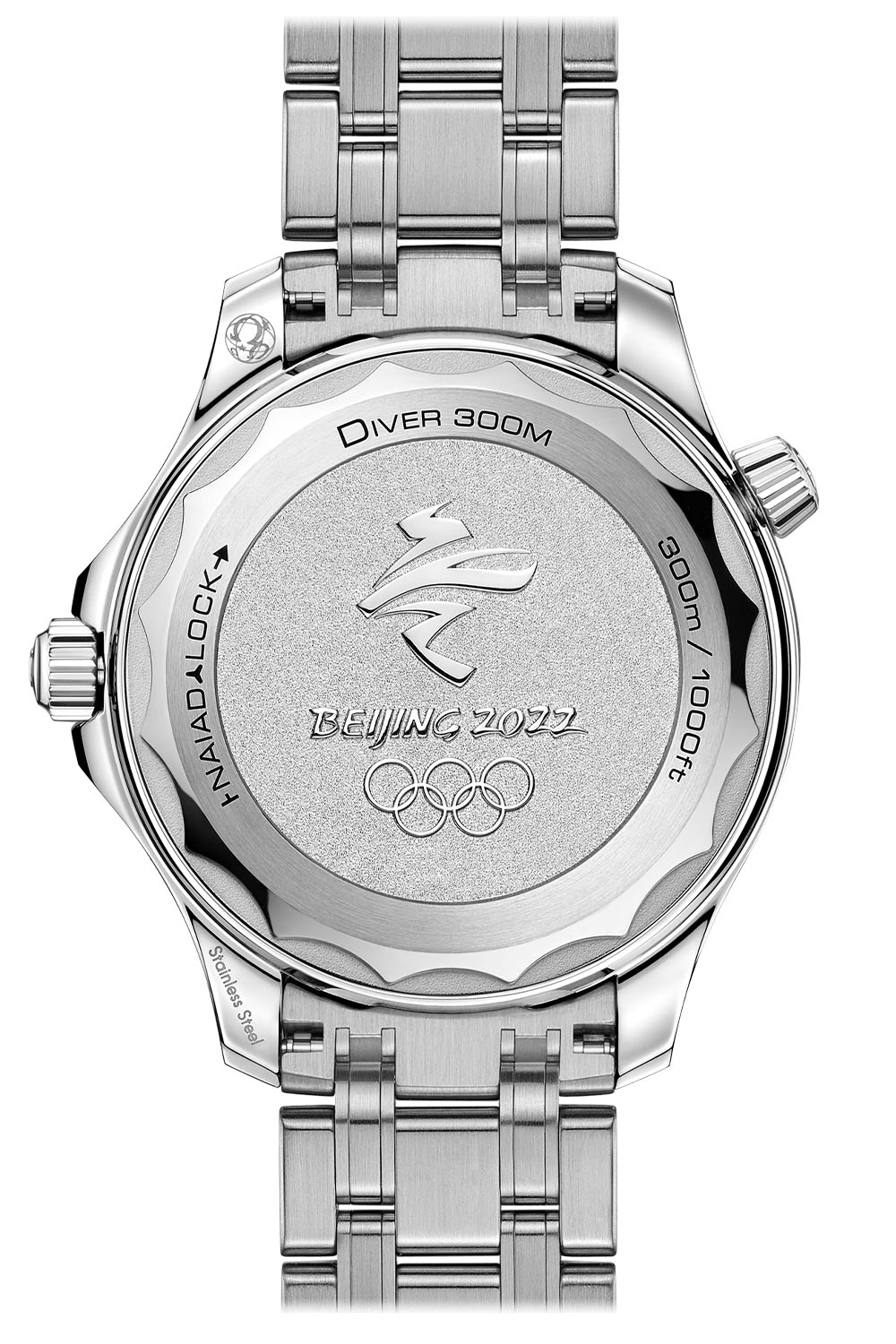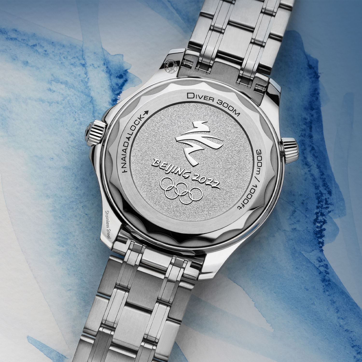 This edition is worn on the classic brushed and polished stainless steel bracelet, equipped with Omega’s patented extendable foldover rack-and- pusher with an extra diver extension. Robust and comfortable, the bracelet complements the watch in terms of solidity and style. Another update concerns the caseback. Instead of sapphire, the watch is equipped with a solid steel back that is decorated with a stamped Olympic Winter Games Beijing 2022 emblem. Note that the caseback is a “NAIAD LOCK”, so the inscriptions with always remain straight.
