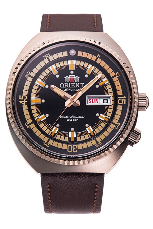 - RA-AA0E06B with bronze-coated stainless steel case, a black dial with beige scales, makers and hands filled with beige lume and a brown leather strap