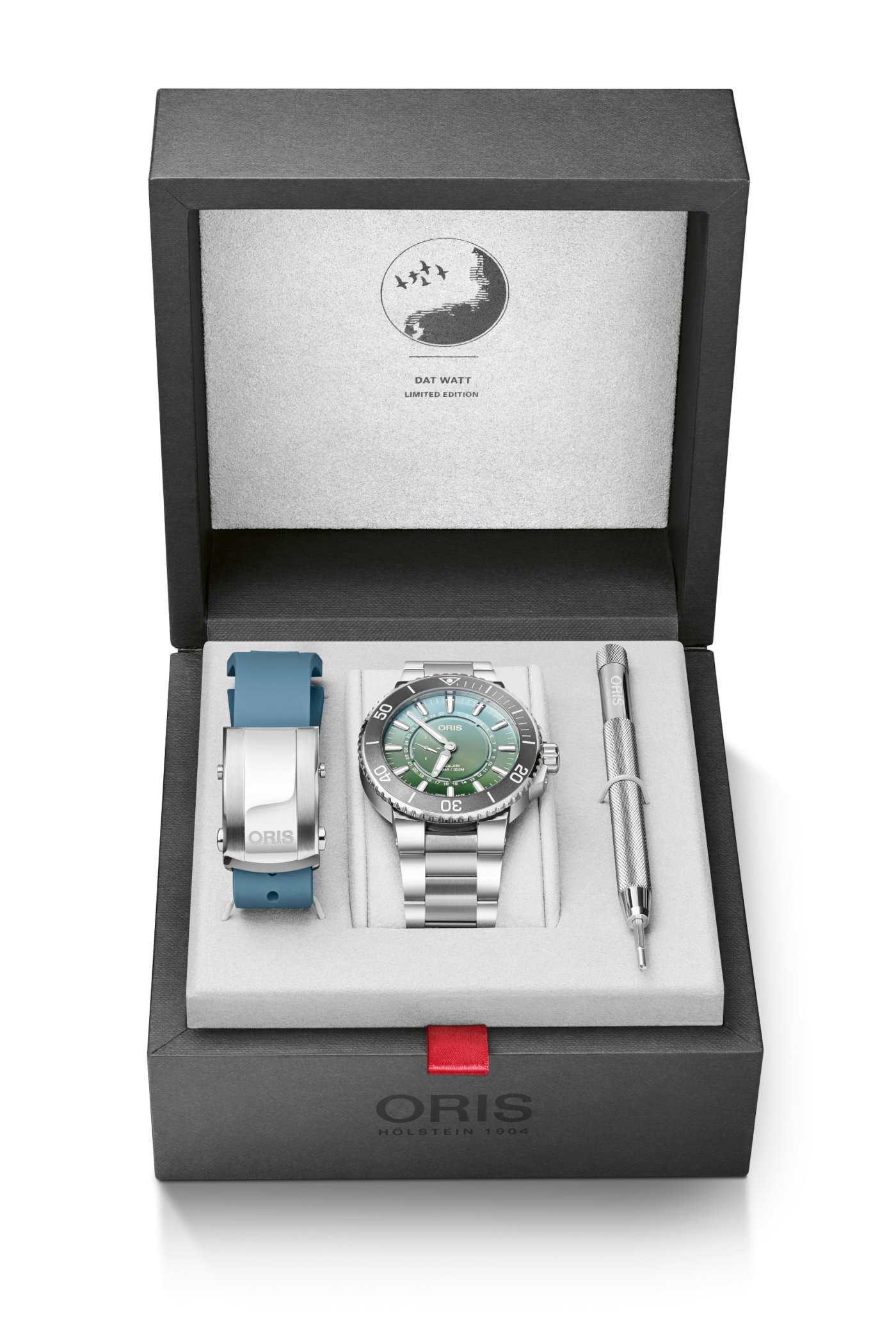 The second edition of the Oris Dat Watt comes with the familiar robust stainless steel bracelet that neatly integrates into the short, stout lugs. This is fitted with Oris’ clever extendable clasp, and you get an additional blue rubber strap also fitted to a folding clasp with a diving extension. A strap changing tool is supplied in the special edition box, to swap from steel to rubber easily. Limited to 2,009 pieces, in reference to the year the Wadden Sea was awarded the World Heritage Site status, and costs CHF 2,900 and should be available as of now.