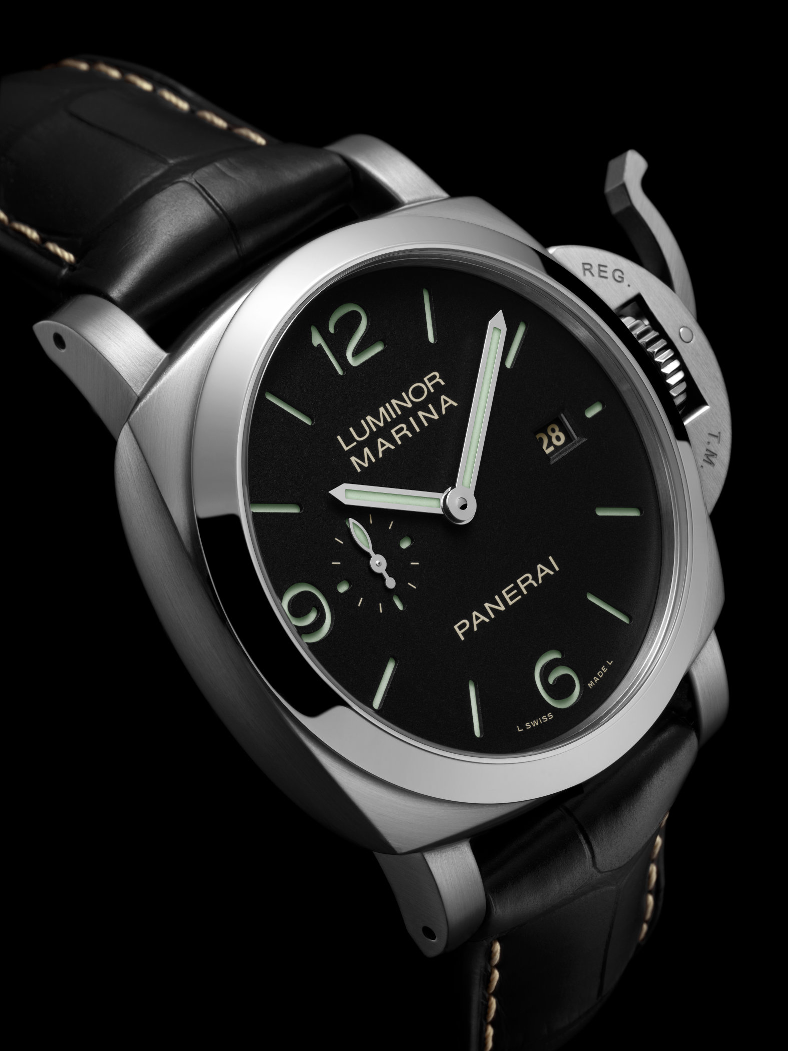 The new P.980 automatic calibre is at the heart of the new Luminor Marina models and visible through the caseback. A manufacture movement made by the Richemont Group, it has a thin height of 4.2mm, a robust 3-day power reserve, a stop-seconds function and a frequency of 28,800vph.