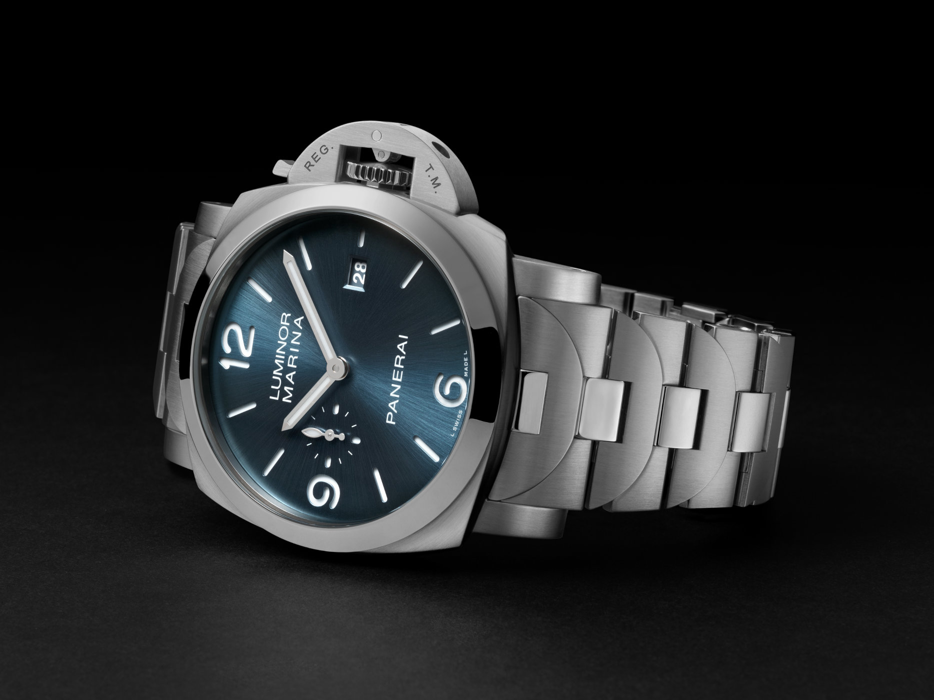 Another first for the Marina Luminor is the PAM Click Release System on the strap and buckle, making strap changes an effortless and tool-free experience. The new V-shaped bracelet design, accompanying the light blue sun-brushed dial ref. PAM03323, tapers from the case to the buckle and features a convenient quick length adjustment system allowing for 2mm extensions without needing tools. For a more classical look, the black dial ref. PAM03312 and white dial ref. PAM03314 both come with a black alligator leather strap; the new dark blue sun-brushed dial colour, ref. PAM03313 is paired with a blue alligator strap. Each model is presented with a complimentary rubber strap.
