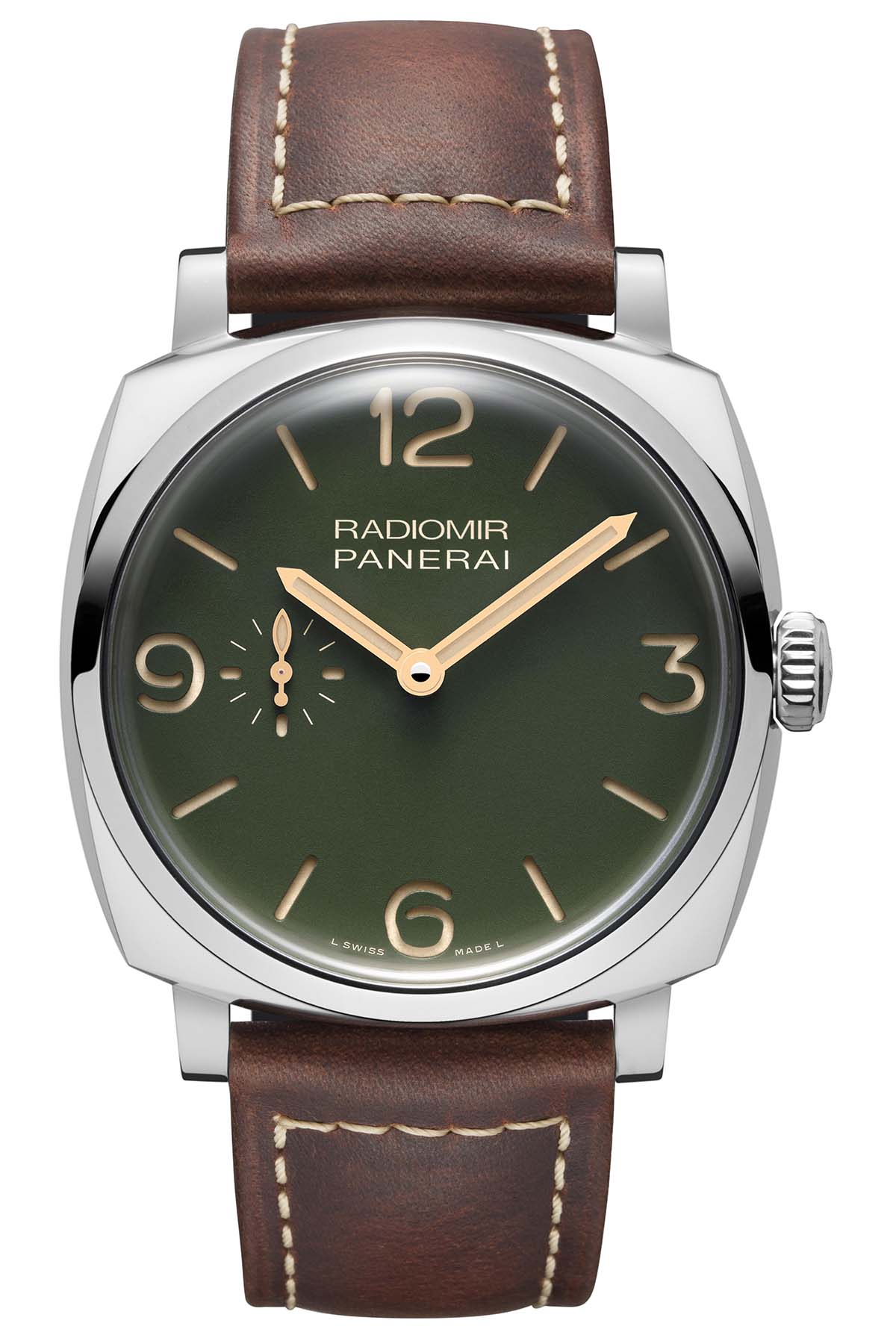 These four new green Panerai Radiomir watches are based on the 1940 model, not the inaugural watch with wired lugs. It thus features a more solid cushion-shaped case with integrated lugs – but not the trademarked crown protection device, which is the apanage of the Luminor models.