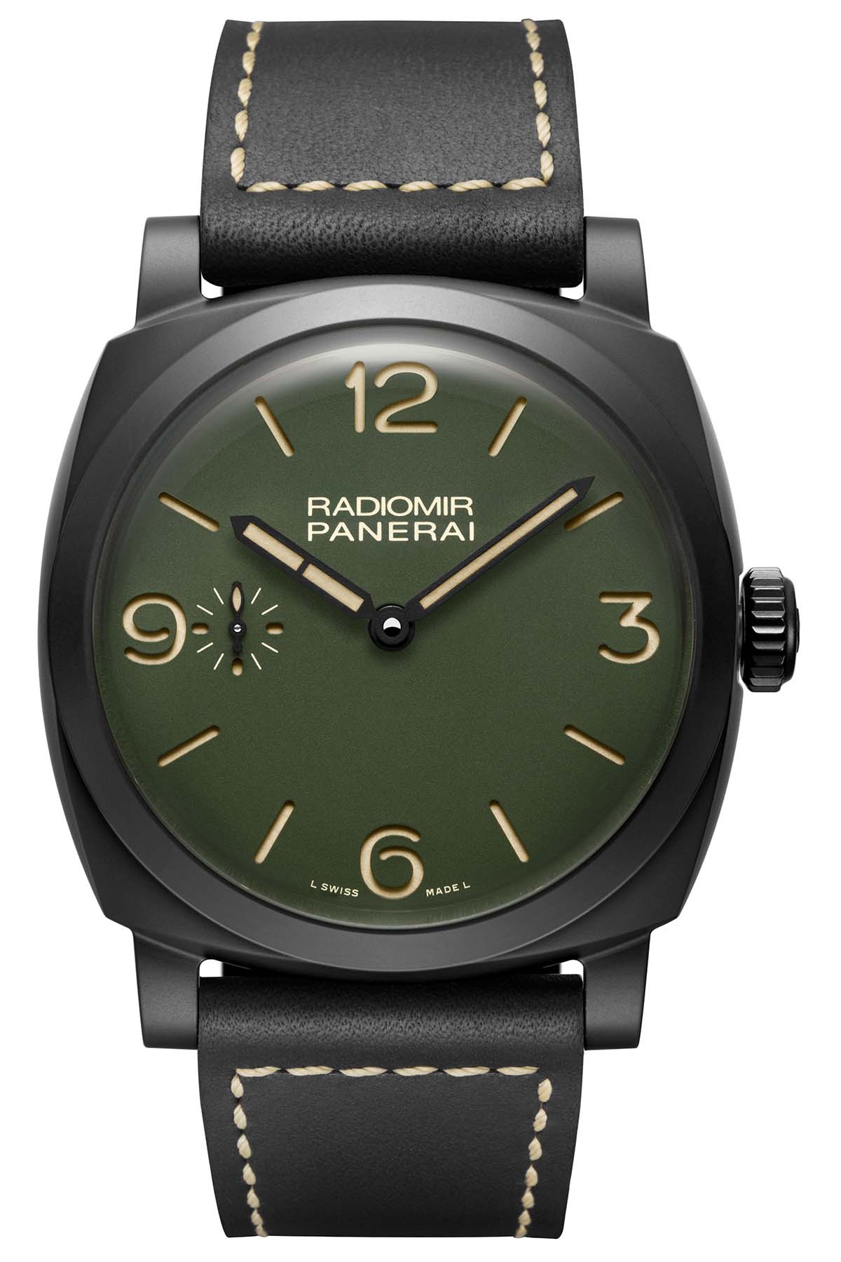 Quick facts: 48mm diameter x 16.12mm height – sandblasted matte black ceramic case, 100m WR – matte military green dial with hours, minutes, small seconds – in-house calibre P.3000, hand-wound – 3Hz frequency and 3-day power reserve – calf leather strap, black, DLC-titanium pin buckle, additional beige canvas strap – PAM00997, boutique only – EUR 12,900