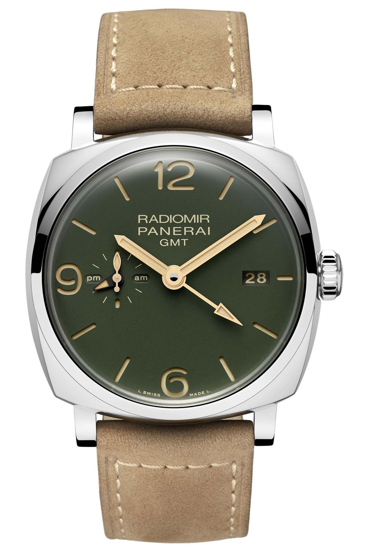 Quick facts: 45mm diameter x 13.95mm height – polished steel case, 100m WR – matte military green dial with hours, minutes, small seconds, AM/PM indication, GMT, date – in-house calibre P.4001, automatic with micro-rotor – 4Hz frequency and 3-day power reserve – calf leather strap, light brown, steel pin buckle, additional beige canvas strap – PAM00998, boutique only – EUR 11,700