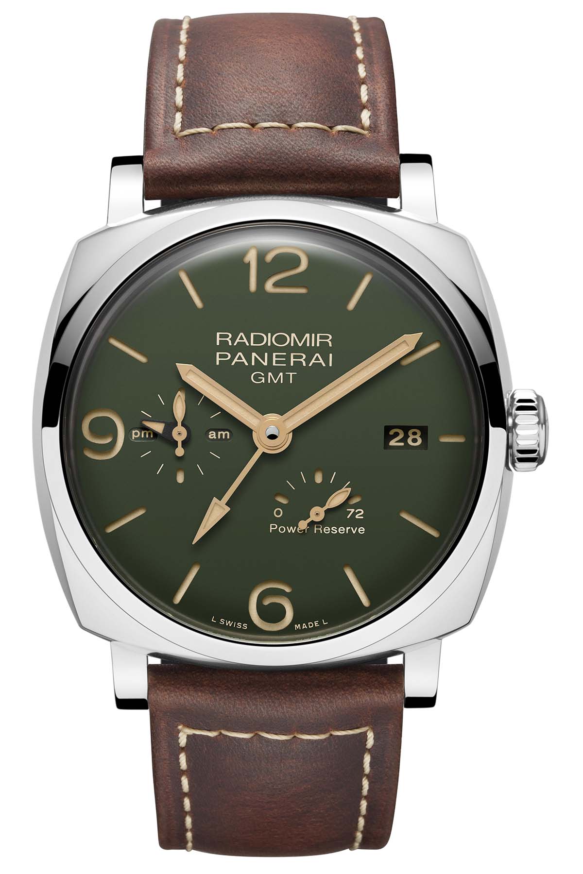 Quick facts: 45mm diameter x 13.95mm height – polished steel case, 100m WR – matte military green dial with hours, minutes, small seconds, AM/PM indication, GMT, date, power reserve – in-house calibre P.4002, automatic with micro-rotor – 4Hz frequency and 3-day power reserve – calf leather strap, dark brown, steel pin buckle, additional beige canvas strap – PAM00999, boutique only – EUR 11,900