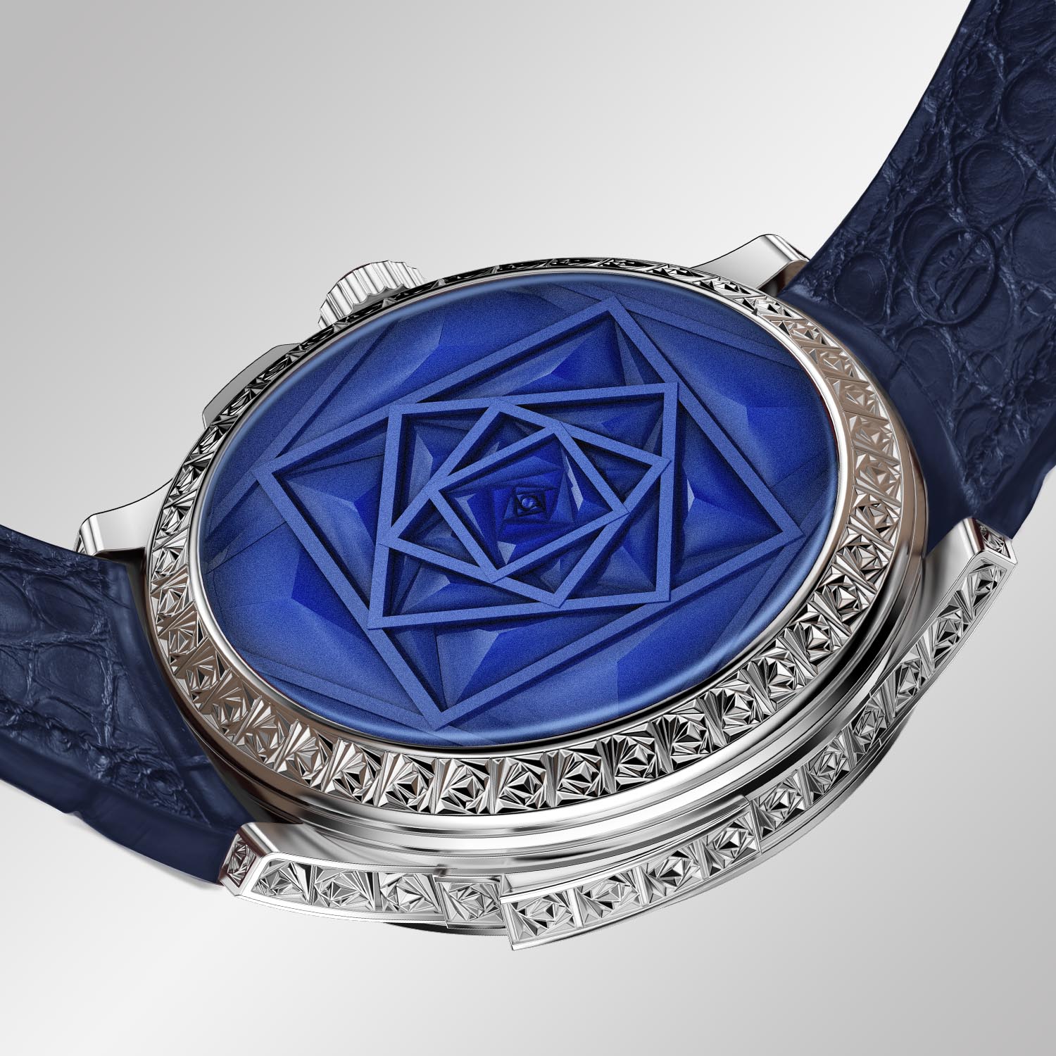 Like the pocket watch, Rosa Celeste has a hunter’s caseback decorated with a large square hand-engraved fractal rose pattern and covered with six layers of deep blue Grand Feu enamel. The solid white gold dial is also embellished with an identical shade of blue Grand Feu enamel but decorated with small carvings to produce a glistening chiselled surface.