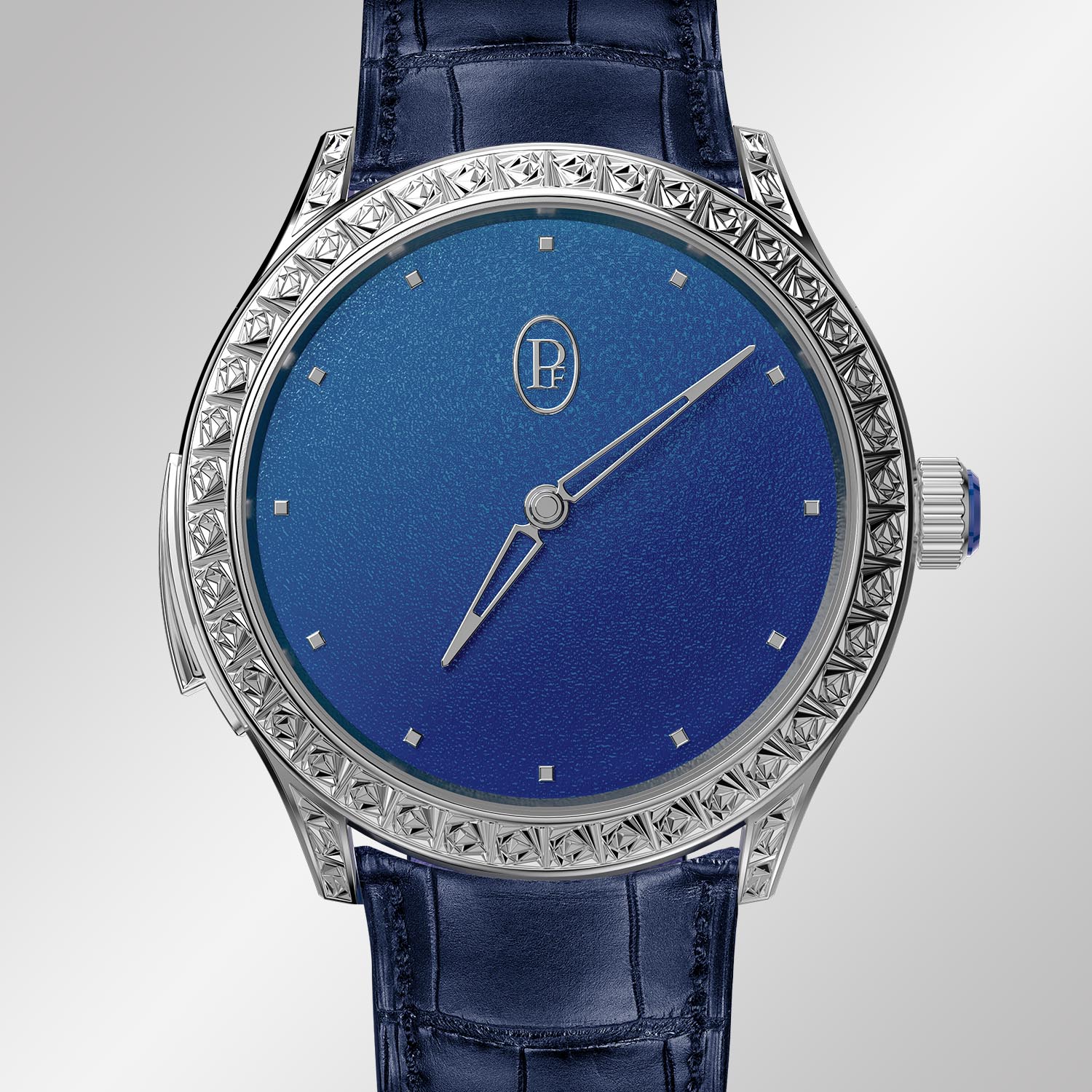 The Parmigiani Fleurier Rosa Celeste comes with a blue hand-stitched alligator leather strap with a white gold pin buckle. It is a one-off edition and retails for CHF 600,000. For more information, please visit parmigiani.com.