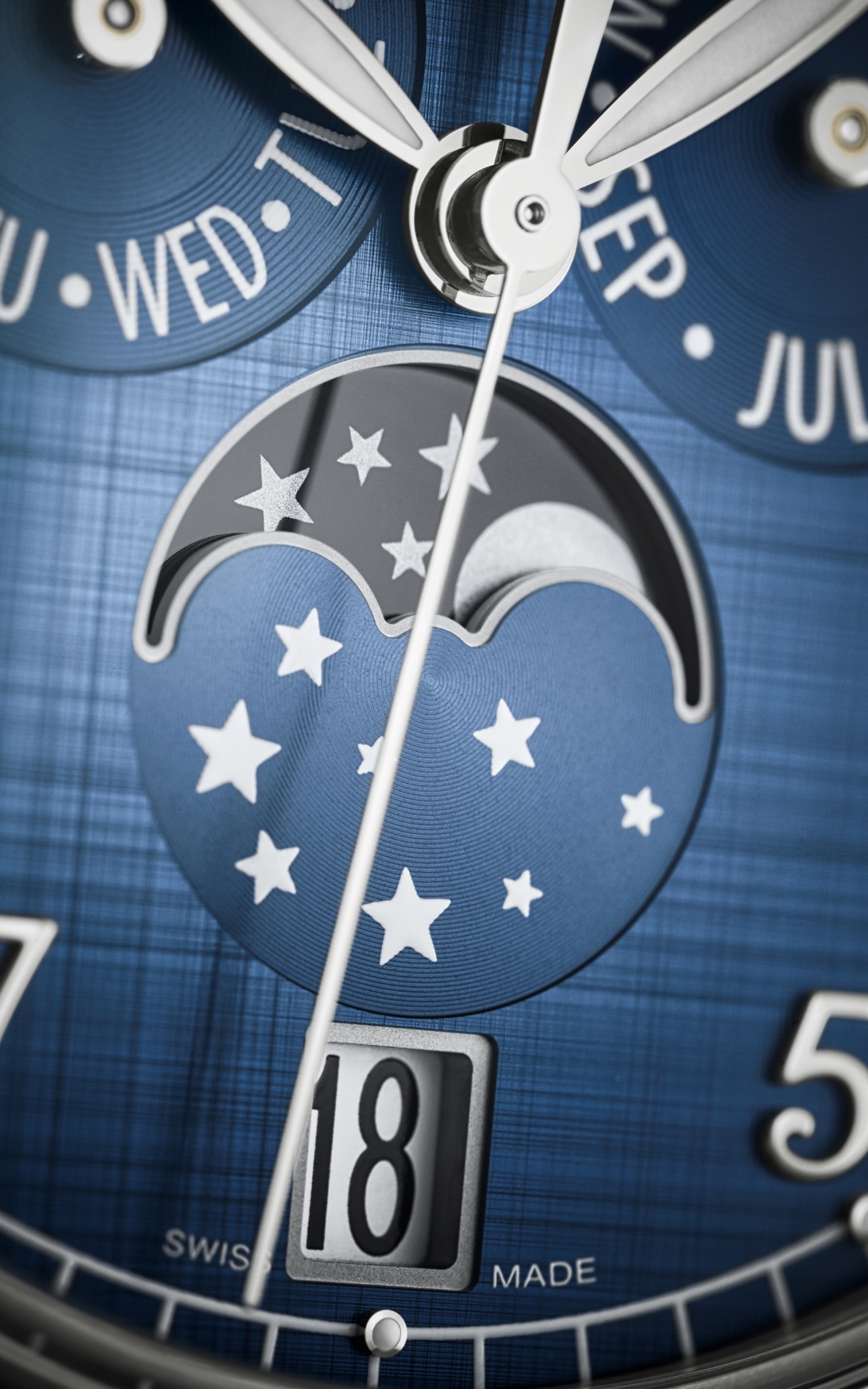 The midnight blue dial of the Patek Philippe Annual Calendar 4947A is decorated with a “Shantung” finishing technique, with both horizontal and vertical satin finish. Time is indicated with leaf-shaped hands filled with a luminescent coating, reinforcing the casual look of this watch. The Annual Calendar indication is divided into two subdials and a date window. The first subdial, at 09:30, indicates the day of the week where the opposing subdial shows the month. A third subdial displays the moonphase, and all three are decorated with a circular pattern. Applied Arabic numeral, in polished white gold, again bring a more modern approach.