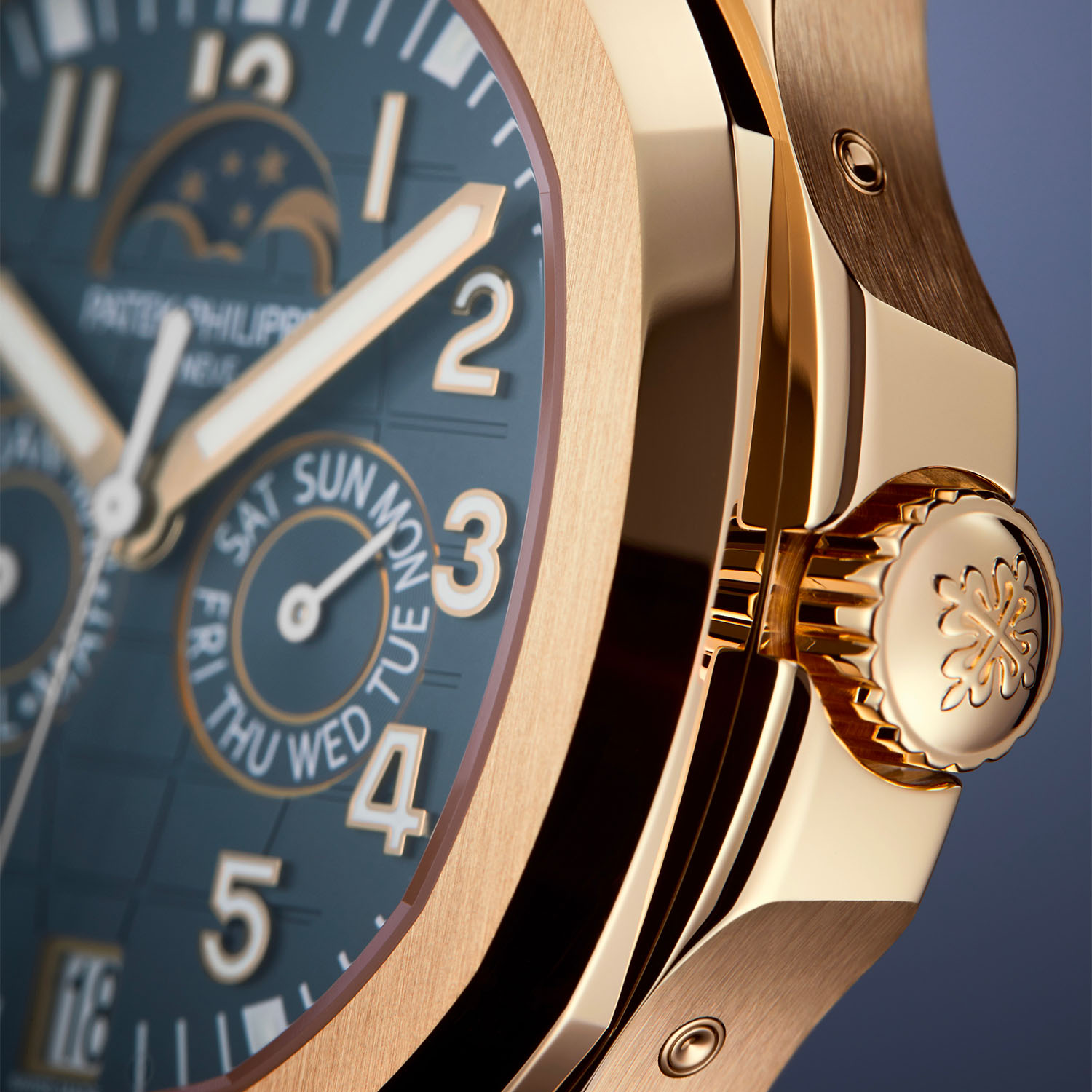 A unisex Aquanaut in rose gold is fitted with Patek's patented annual calendar complication.