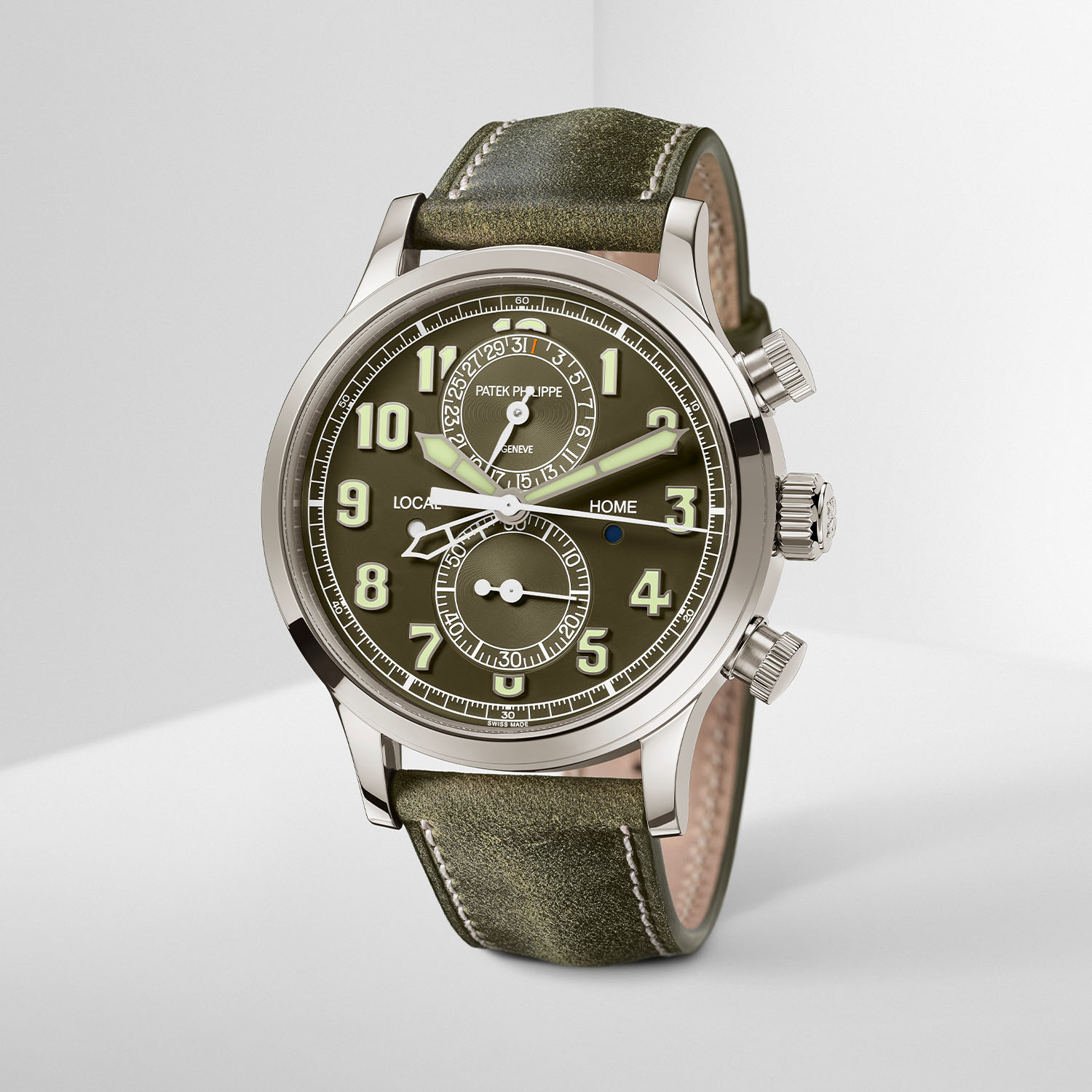 Offered in two contemporary colours – sunburst blue-grey or lacquered khaki green – the dials uphold the vintage aviator codes of the Calatrava Pilot. The retro Arabic numerals, the cathedral-style hands and the minutes track all reference the original, but to accommodate the new flyback chronograph, the design of the dial has changed somewhat.