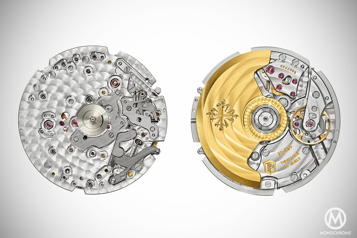 It is a complicated movement, that brings the finest in terms of chronograph’s activation: a column-wheel with vertical clutch. What is the advantage of this configuration: having a precise and instantaneous start of the second hand, without the small initial jump that can be found on the cam-operated chronographs. The other advantage founds here a lot of sense: as it comes with a vertical clutch, it is nearly friction-free. For that reason, the sweep chronograph hand can be used as a permanently running seconds hand, with (almost) no alteration of the rate accuracy. With a non-vertical clutch, activating the second hand permanently can affect the precision of the watch, due to frictions. Here, Patek Philippe just reinvented the concept of the Chronostop – 1960s watches made by Omega with only a central second-hand to time events – in a complicated and refined way.