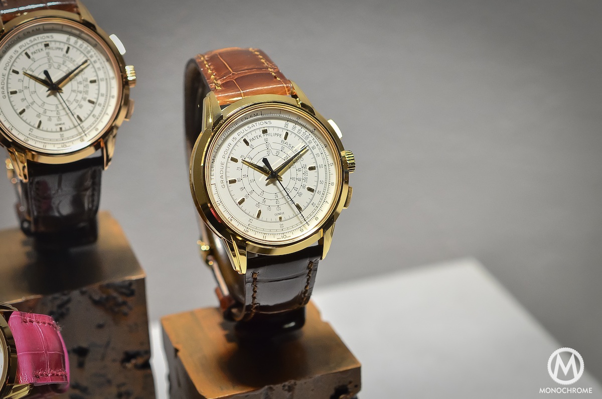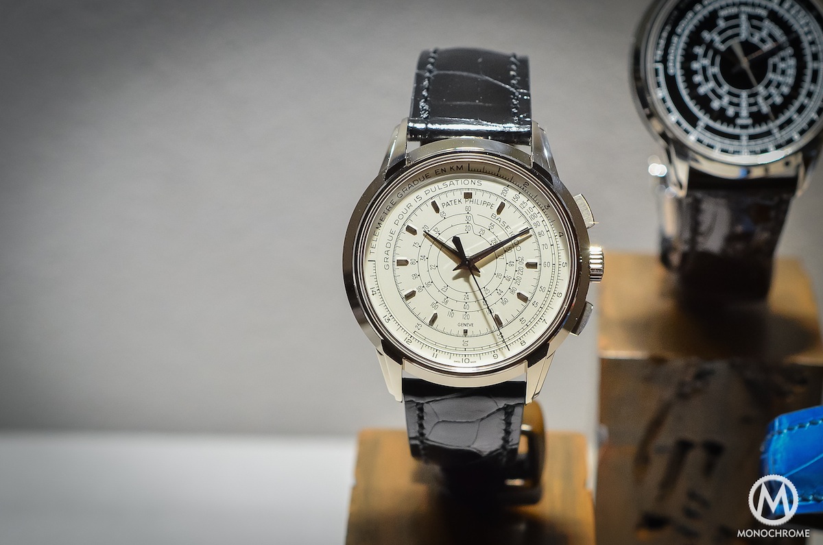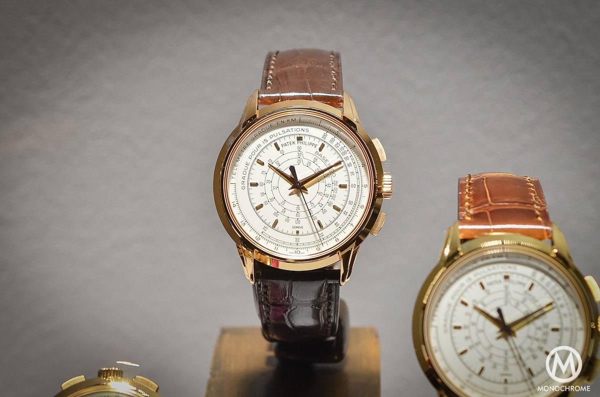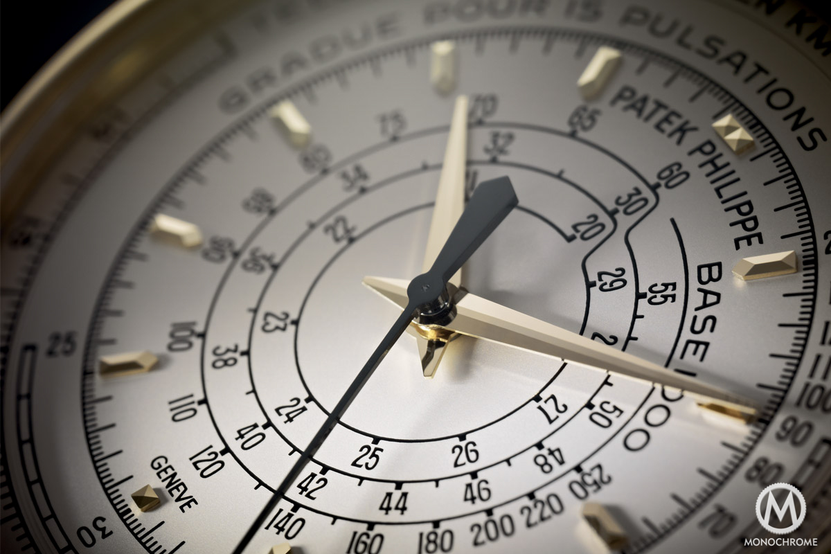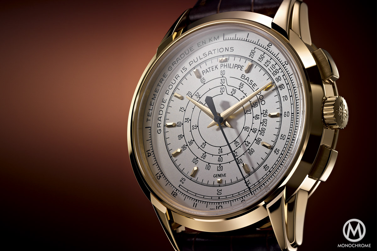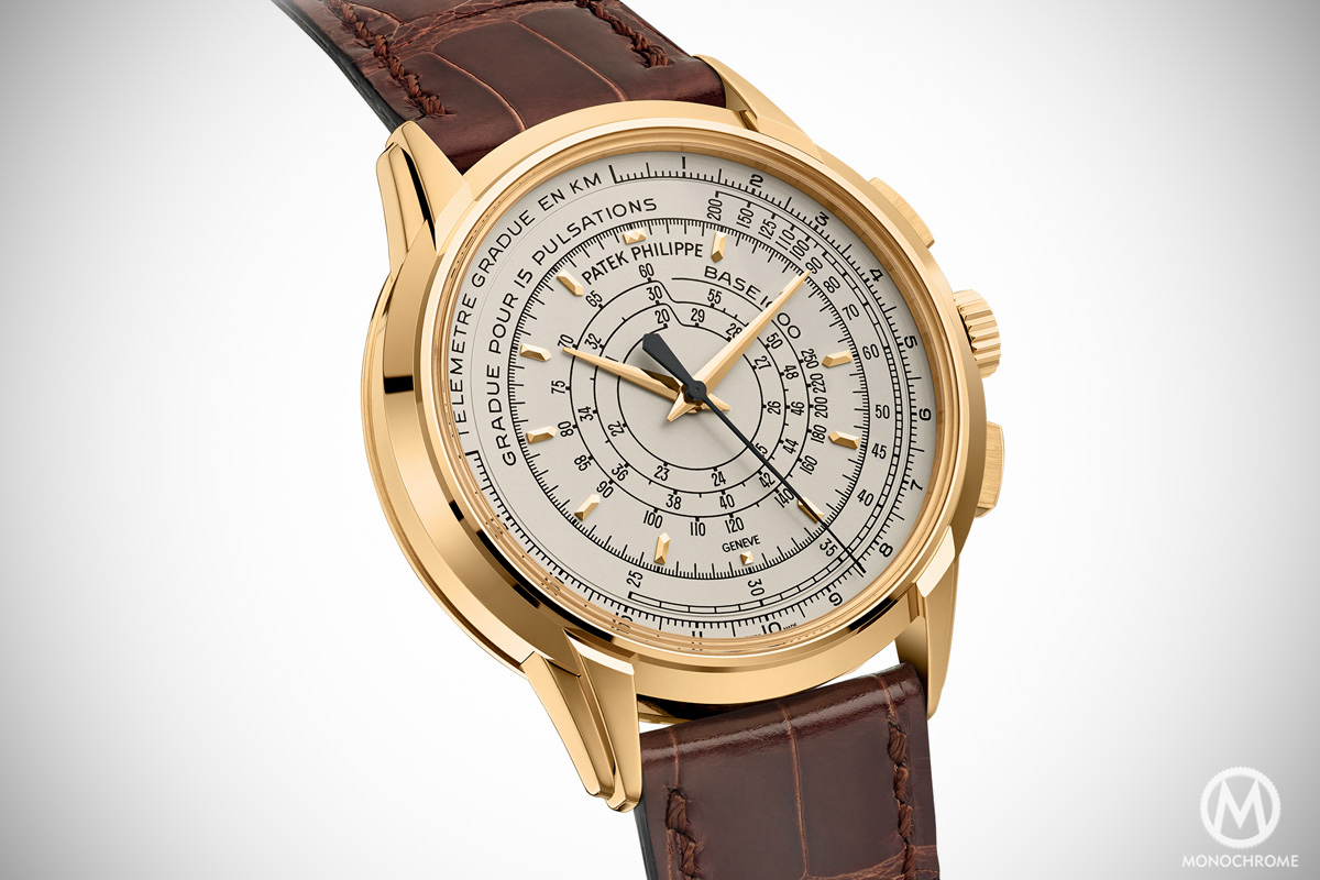 The Patek Philippe Multi-Scale Chronograph Ref. 5975 comes with a very specific layout that had not been seen for decades, a three-scale timing ‘computer‘. Nowadays, most of the chronographs are coming with a tachymeter scale (which is mostly used as a decoration). And until the 1960s/1970s it was not unusual to see chronographs with multiple scales, especially not for military tool-watches. Patek now reintroduces this display, as the 5975 comes with the 3 most usual scales, meaning a telemeter, a pulsimeter and a tachymeter.