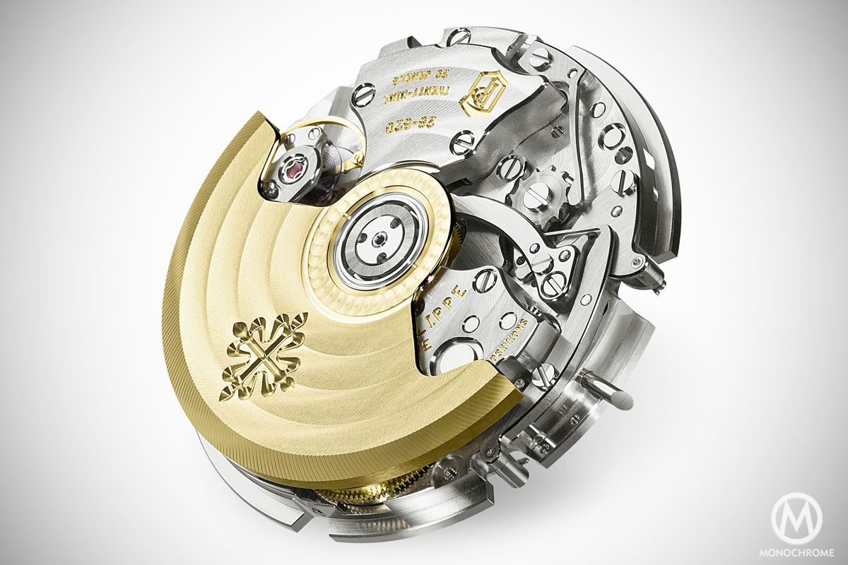 Inside the 5975 ticks an in-house movement, the Calibre CH28-520. It is not a new movement (at least, if the base is not new, this configuration without counters is) as it was already featured in the Nautilus Chronographs, both the previous Ref. 5980 and the actual Travel Time Ref. 5990, revealed this year at Baselworld. What is exactly the Calibre CH28-520? It is a self-winding movement that boasts min. 50 hours of power reserve and that comes with a full rotor on the top, made of 21k gold. It has an integrated construction, meaning that the chronograph functions – Column-wheel, levers and gears – are not added as a module on the top of a base caliber. All these elements are part of the movement itself for a better flow of power and compactness.