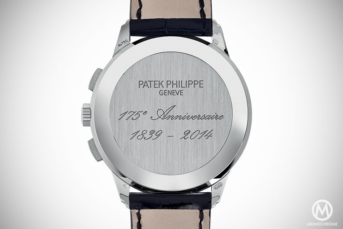- Case: round, 40mm x 10.25mm, 18K yellow, white, or rose gold or platinum 950, solid gold or platinum back with engraving “PATEK PHILIPPE GENEVE 175e Anniversaire 1839 – 2014“. Water-resistant to 30 m.