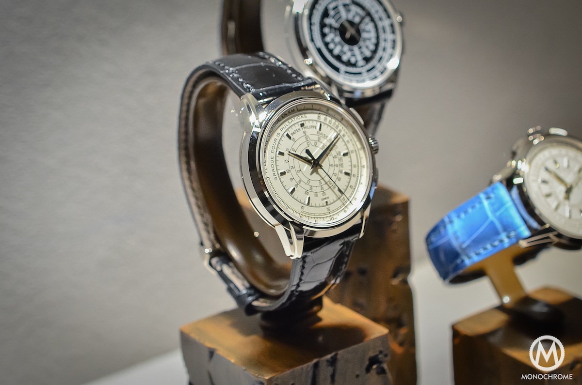 - 5975G – limited to 400 pieces – CHF55,000 – 18k White gold case, silvery opaline dial with black printed scales, shiny black alligator strap