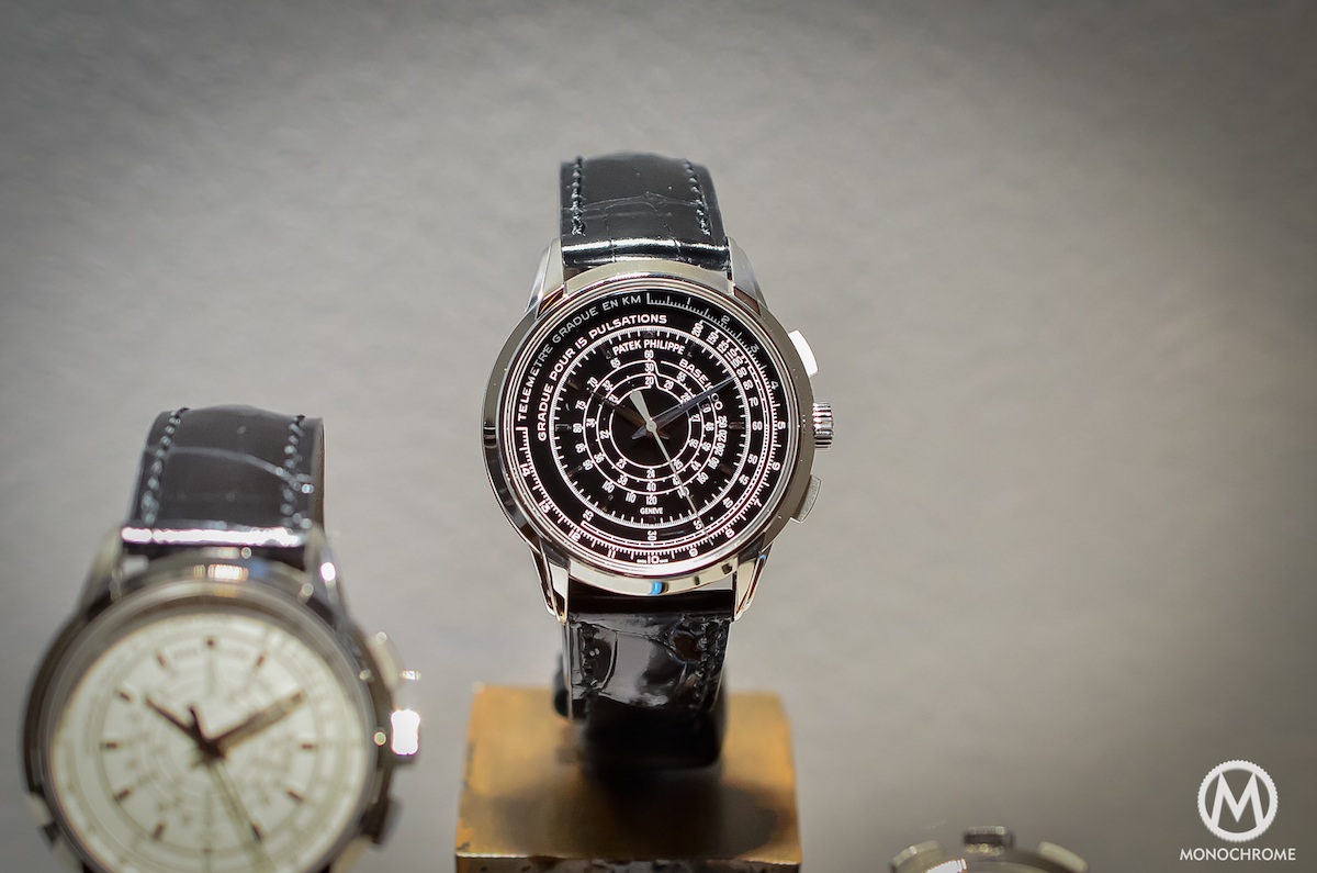 - 5975P – limited to 100 pieces – CHF78,000 – Solid platinum case, black lacquered dial with white printed scales, shiny black alligator strap