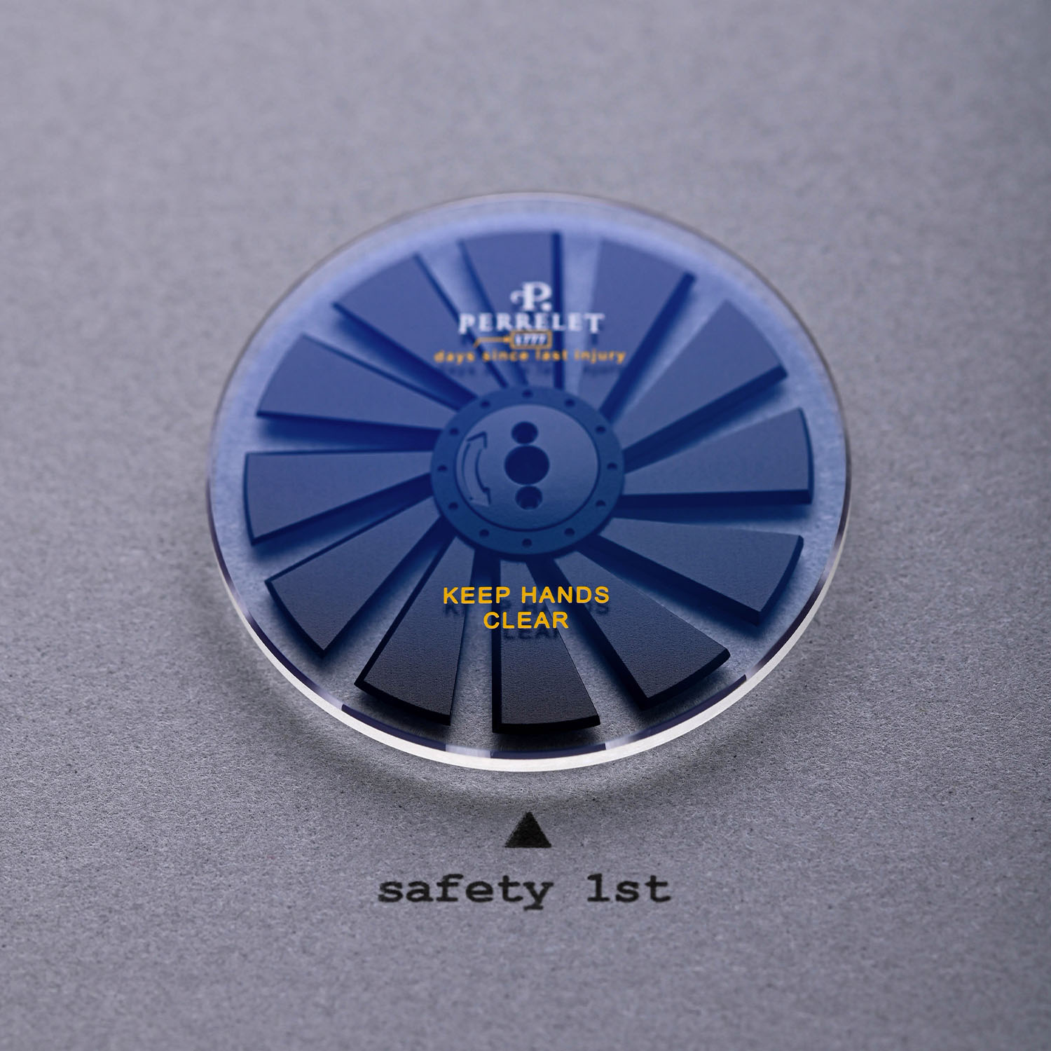 The predominantly black dial has white markings on the outer minute track. Perrelet’s signature embossed hour markers and Arabic numerals are coated in Super-LumiNova for enhanced low-light visibility. The central hour and minutes hands have the same treatment, ensuring excellent legibility. The traditional seconds hand has been replaced with a “Keep Hands Clear” safety sign – a familiar warning found near moving machinery and sharp-edged components.