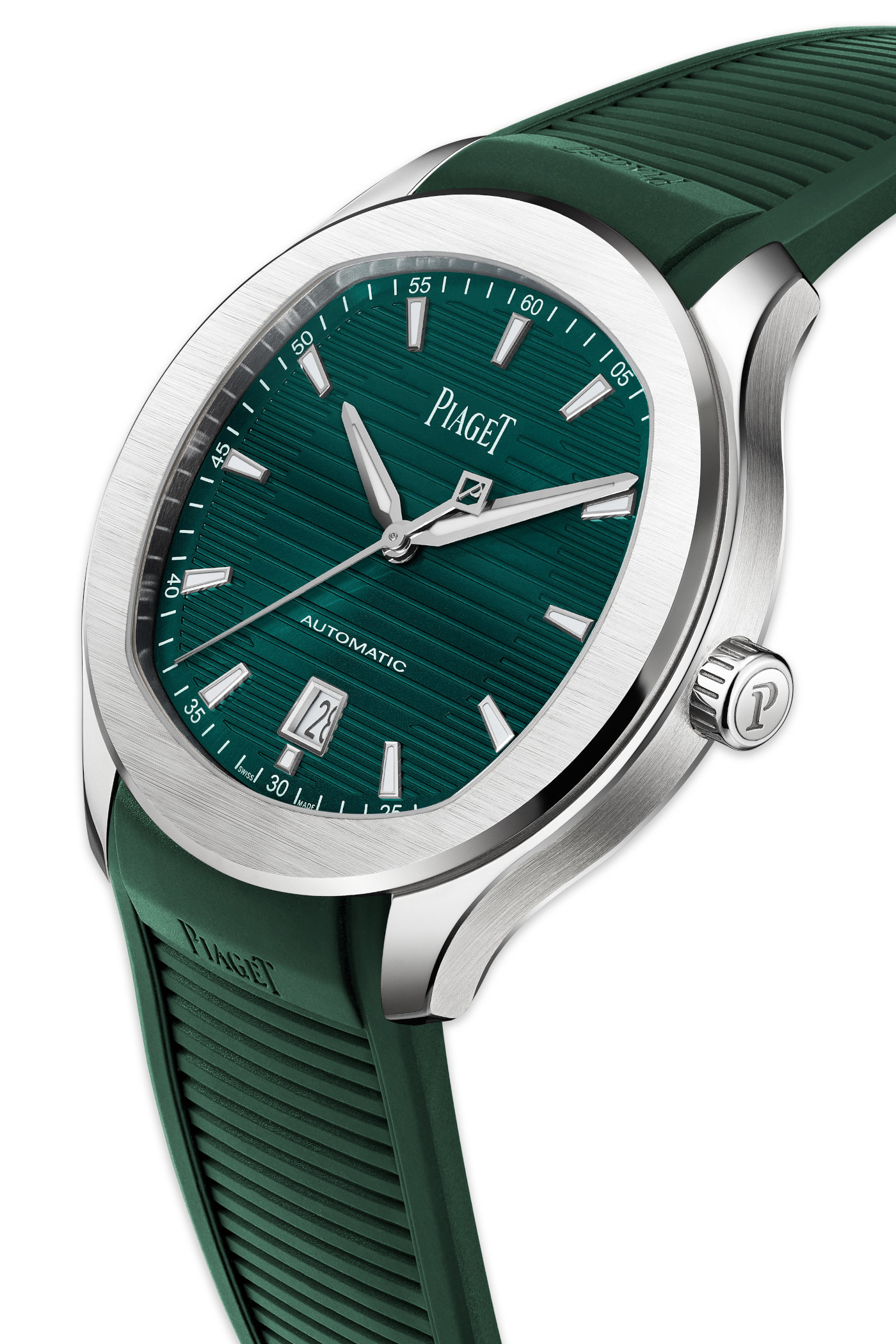 The novelty here is the different pattern on the dial. Although the gadroons are still present, they are thicker and feature shorter incisions to replicate the texture of the interchangeable rubber strap. The shorter incisions inside the wide gadroons are arranged around the dial’s periphery, further underscoring the cushion-shaped minutes track and bezel. We haven’t seen the watch in the metal, but we have to trust the brand’s press release when it describes the chameleonic personality of the dial that plays with the light. The indices are faceted, applied to the dial, and treated with luminescent material like the hour and minute hands. The central seconds hand has a “P” counterweight, and the date window with its white background is framed at 6 o’clock.