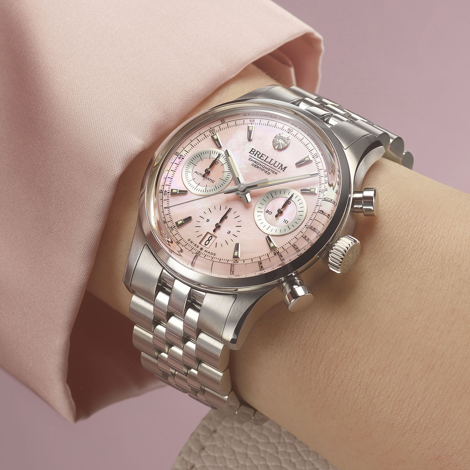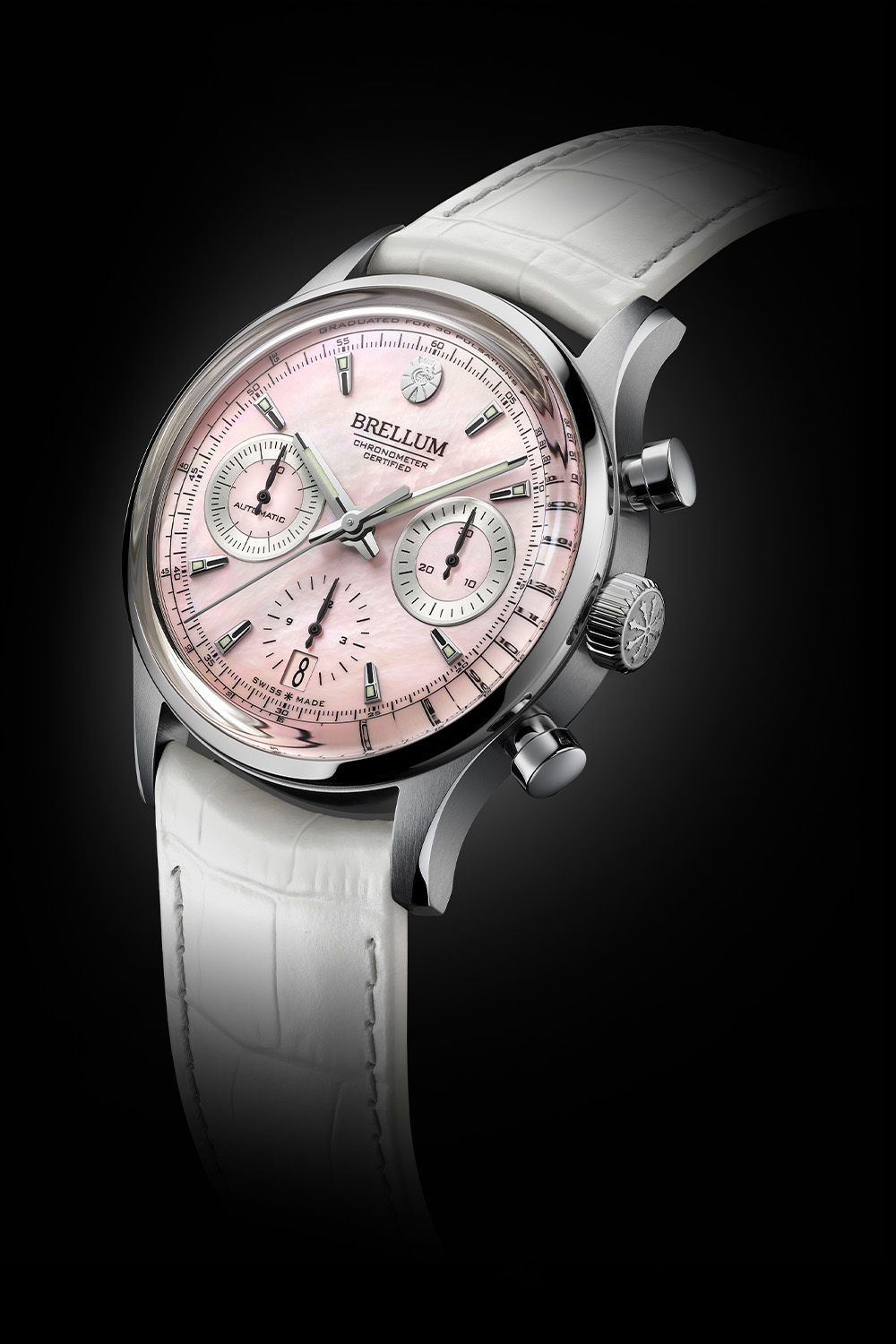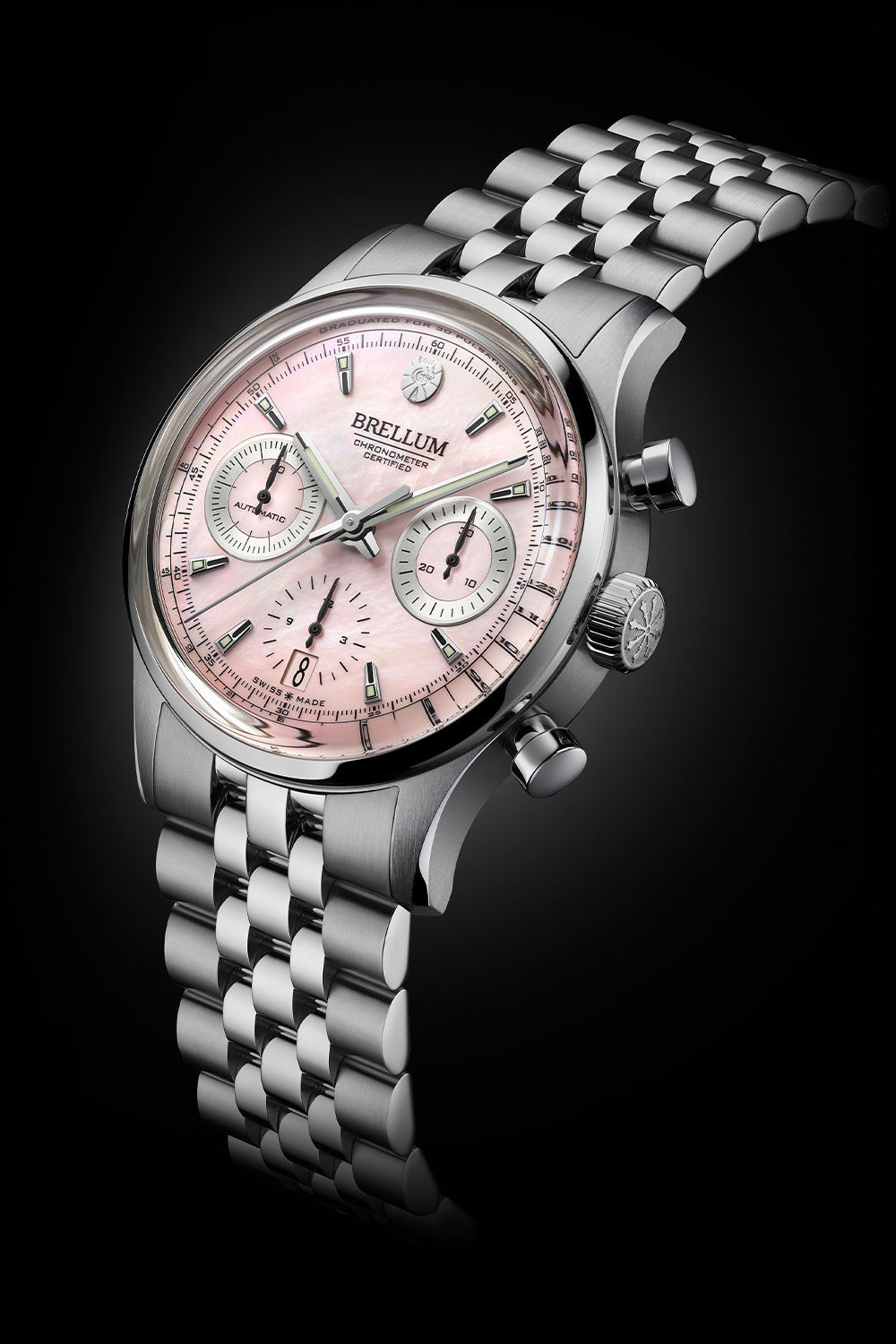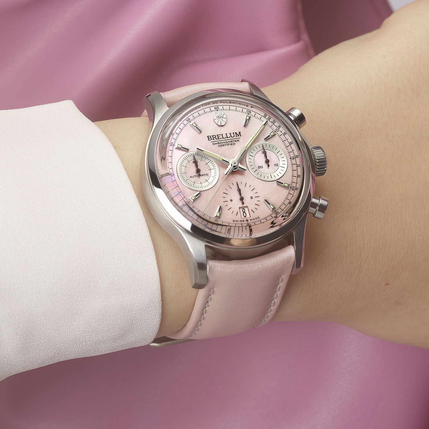 Just in time for Valentine’s Day, Brellum’s compact 39mm chronograph sports an attractive pink mother-of-pearl dial.