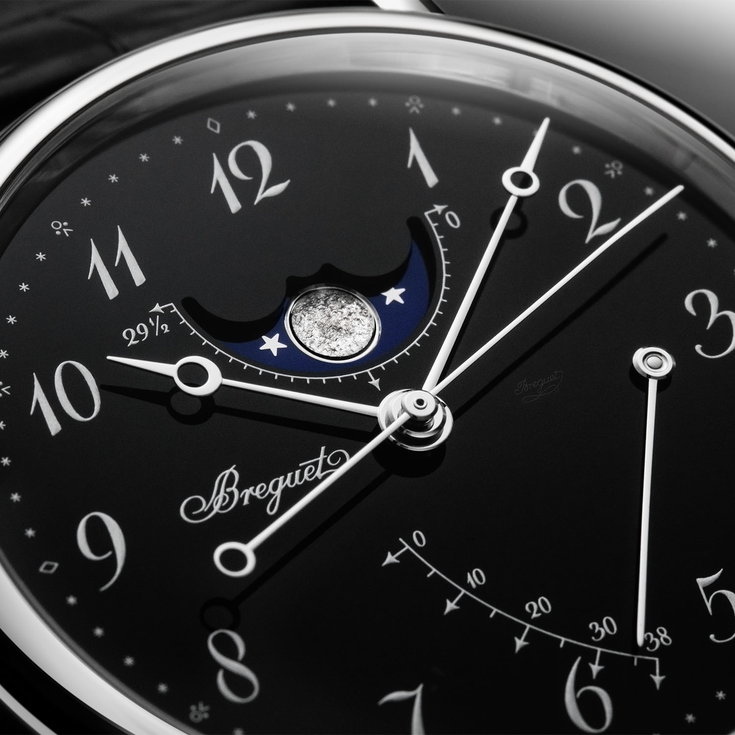 Both references come on black alligator leather straps, although the simpler 5177 has a platinum pin buckle, and the moon model has a triple-folding clasp. The price is CHF 36,800 for the Classique 5177PT and CHF 43,800 for the Classique 7787PT. More information at breguet.com.