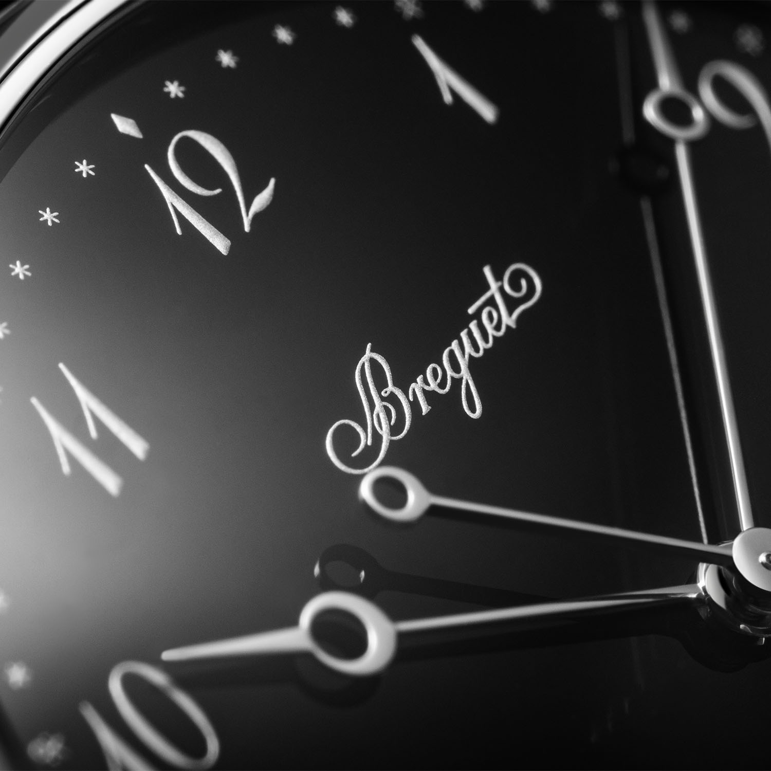 Grand Feu enamel is not new to the Classique collection and has embellished models like the Classique Tourbillon Plat 5367PT, the Classique 7637 Répétion Minutes and the Classique 5177. A highly specialised craft, Grand Feu enamel requires the application of successive layers of enamel fired at temperatures of 800ºC. Black Grand Feu enamel is one of the challenging colours and requires immense talent and patience to produce the sleek, inky black uniform dials of the Classiques. The payoff is that the glossy surface will never fade over time. In contrast, both references feature signature Breguet Arabic numerals in powdered silver indicated by rhodium-plated “moon” tip Breguet hands.